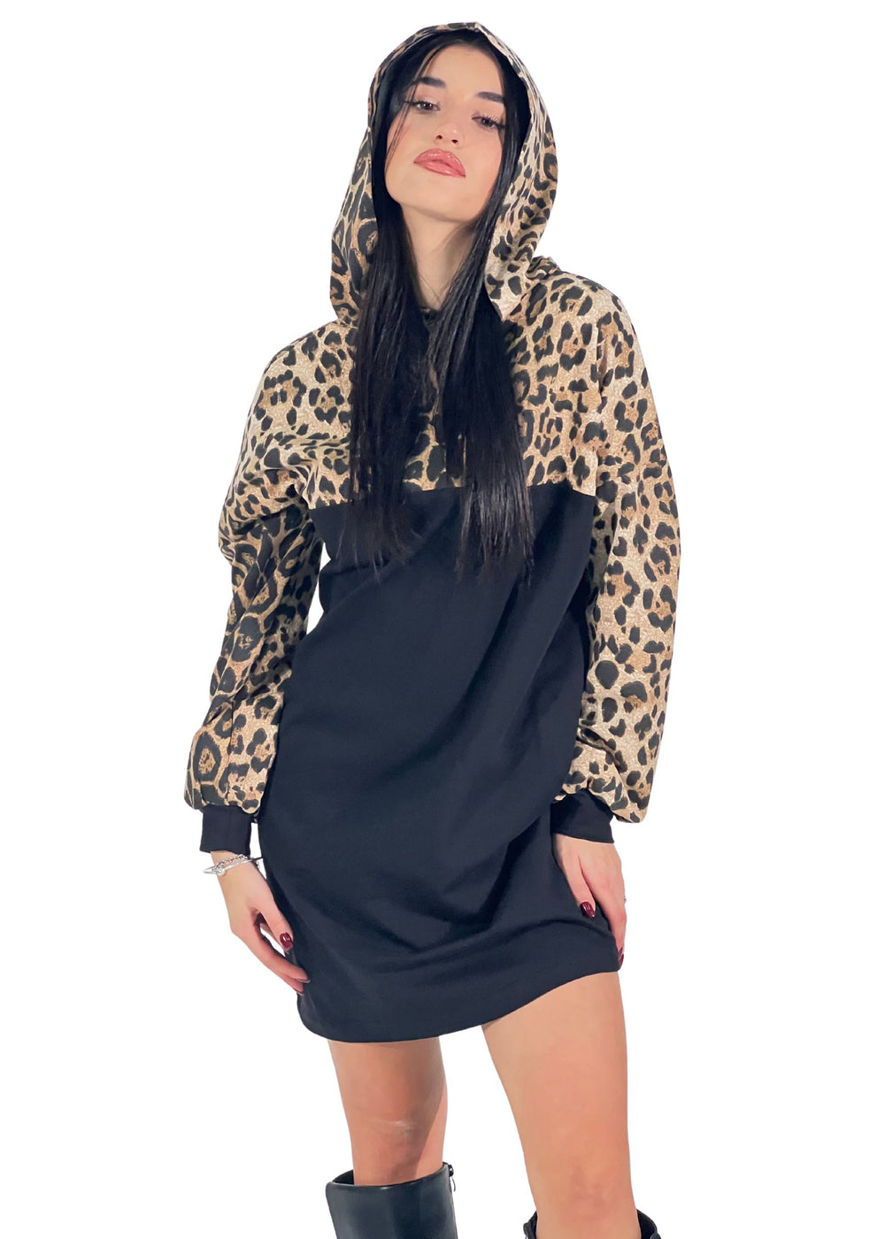 • 🖤 Design contemporaneo: abito corto in felpa nera con dettagli leopardati su maniche e parte superiore.