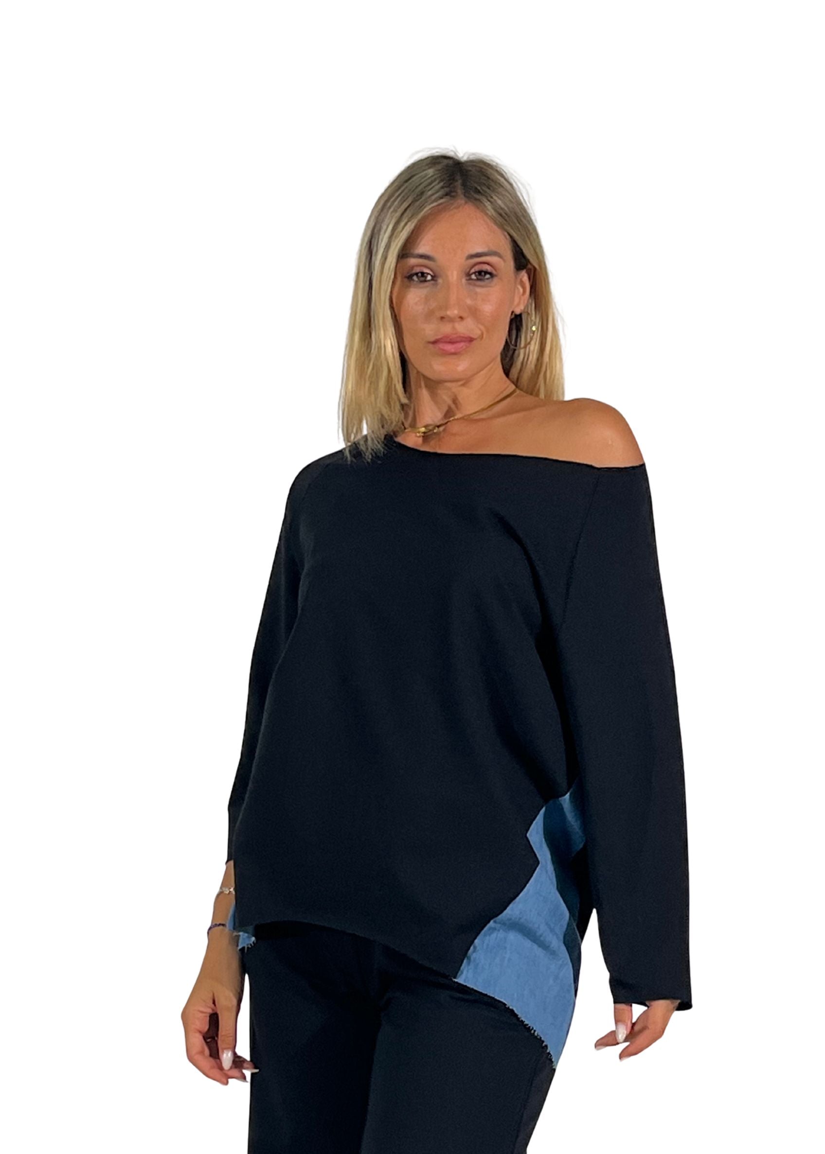 - Dettaglio unico: Parti laterali in denim blu scuro a contrasto