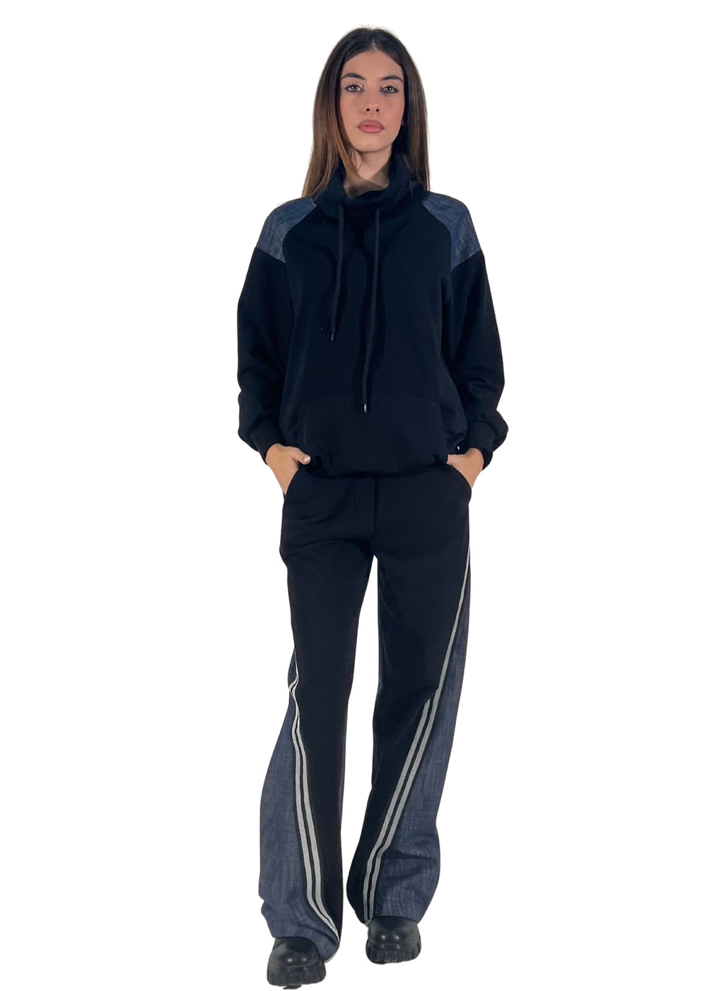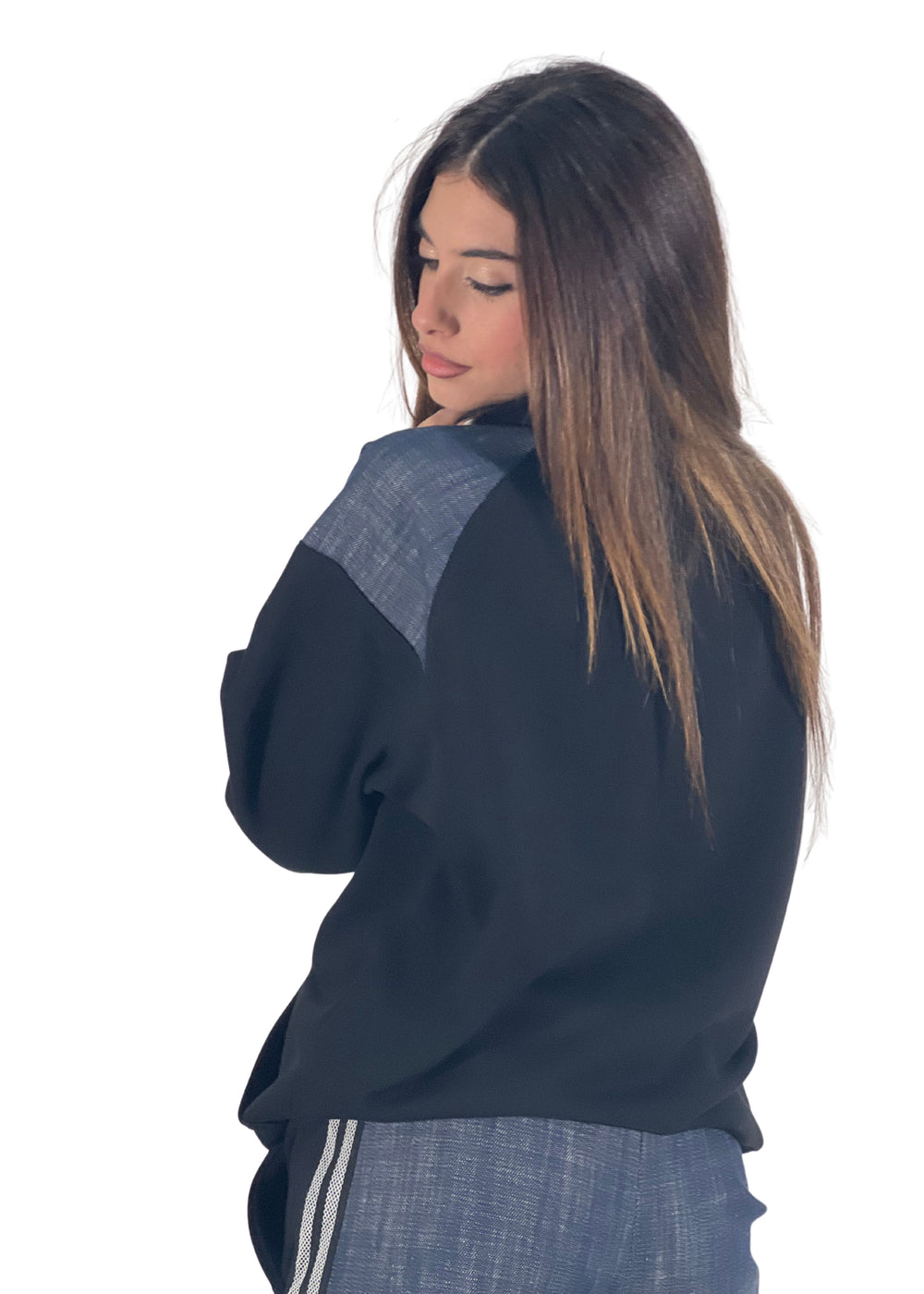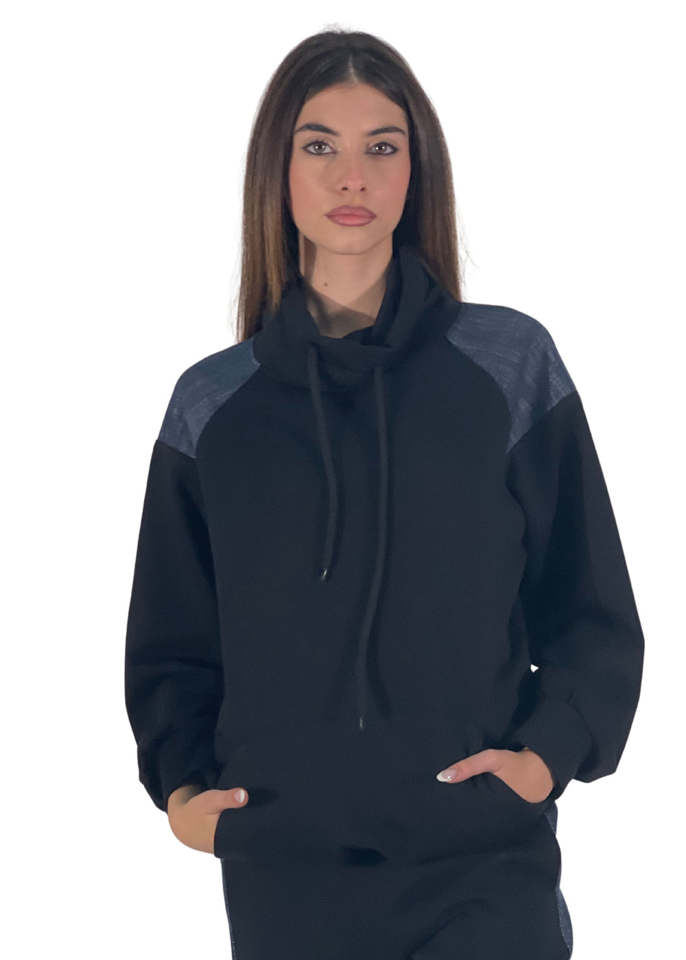 Comoda, essenziale e contemporanea — la felpa Kirki unisce stile e praticità in un unico capo. Realizzata in tessuto tecnico morbido e strutturato, presenta dettagli in denim sulle spalle che aggiungono un tocco urban-chic al look.