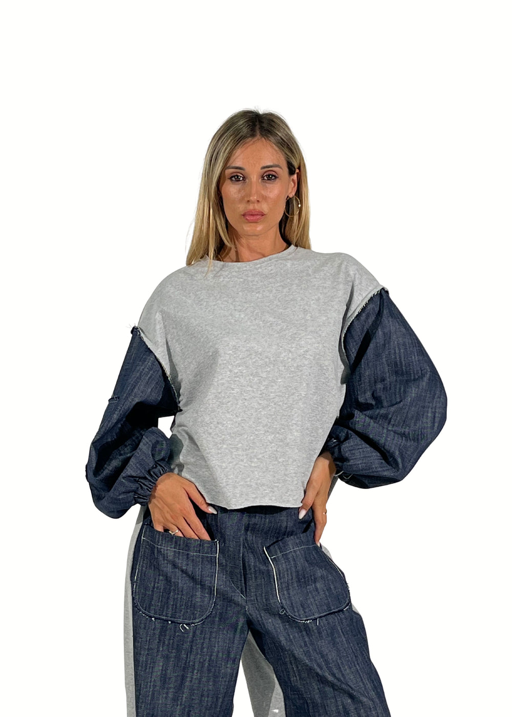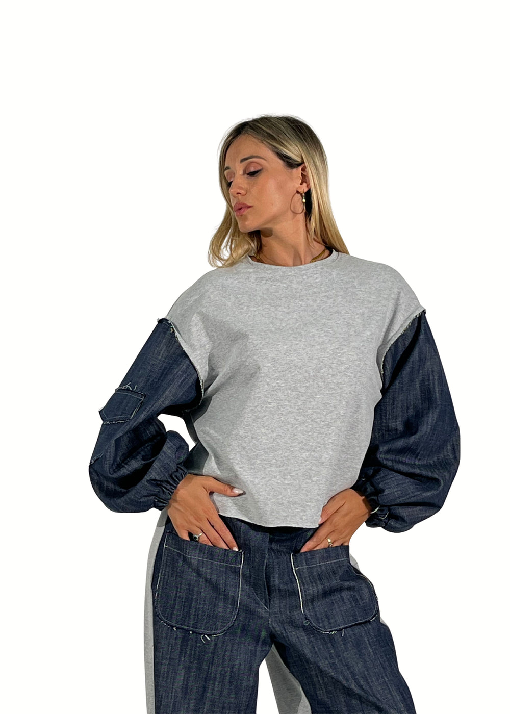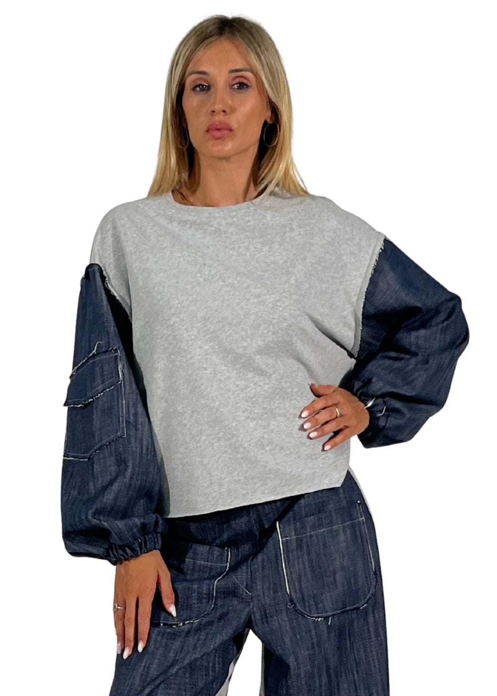 • Maniche ampie in denim blu con cuciture a vista per un effetto urbano