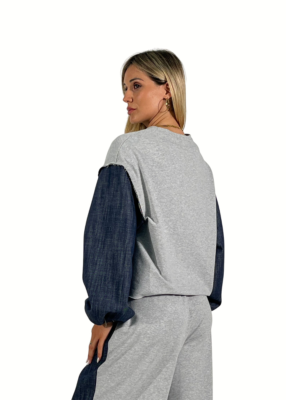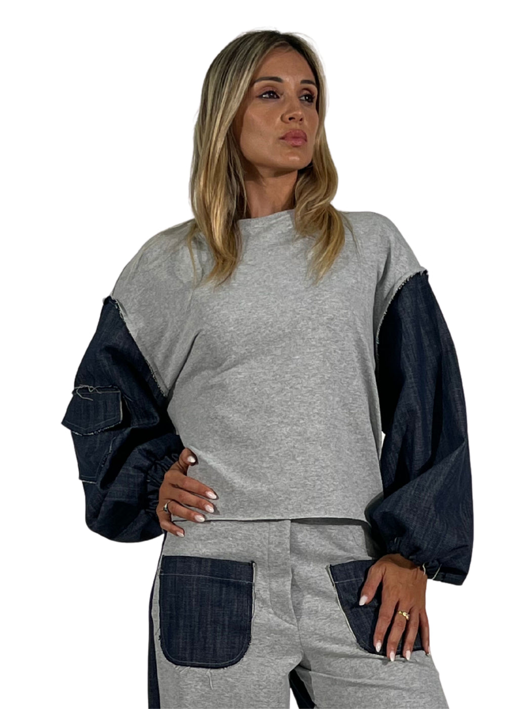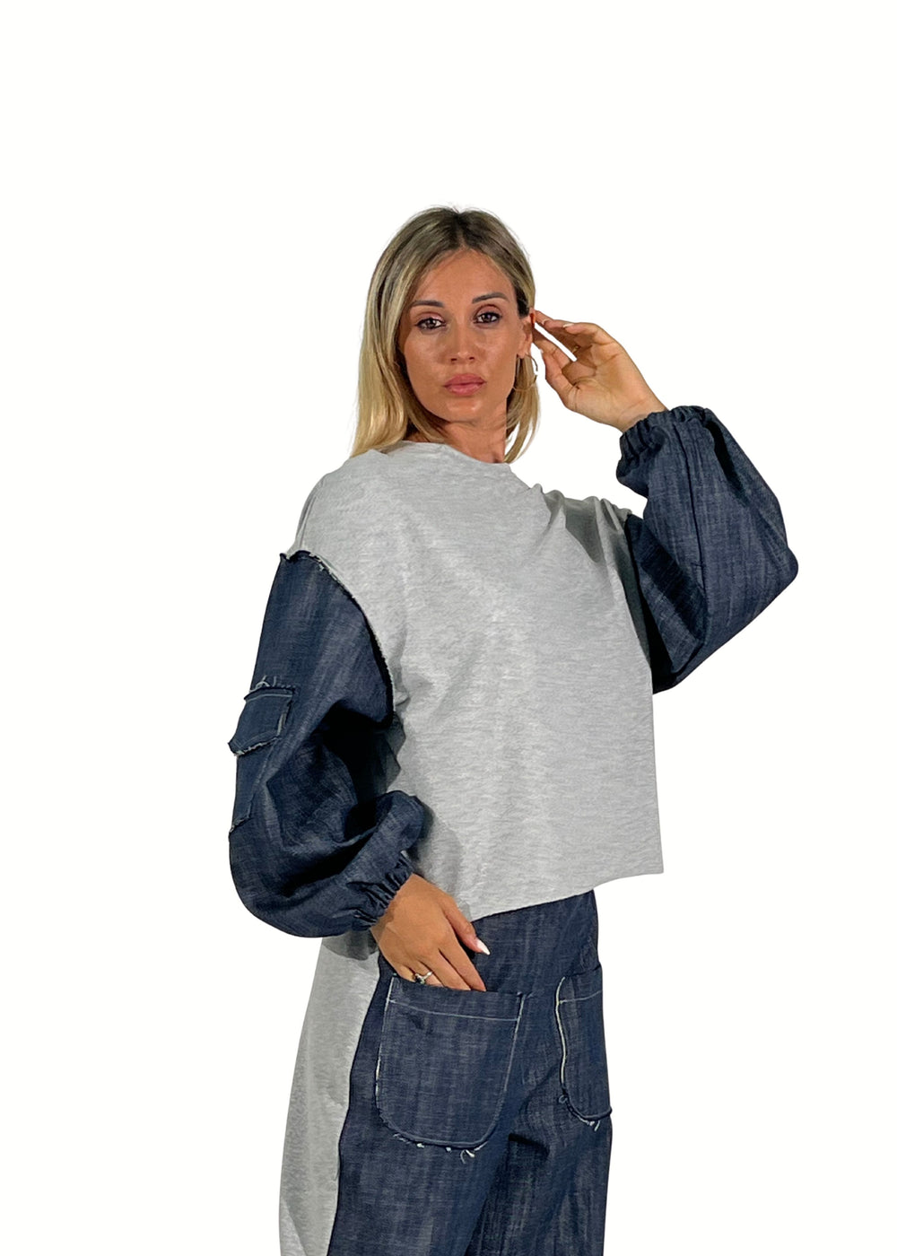 • Maniche ampie in denim blu con cuciture a vista per un effetto urbano
