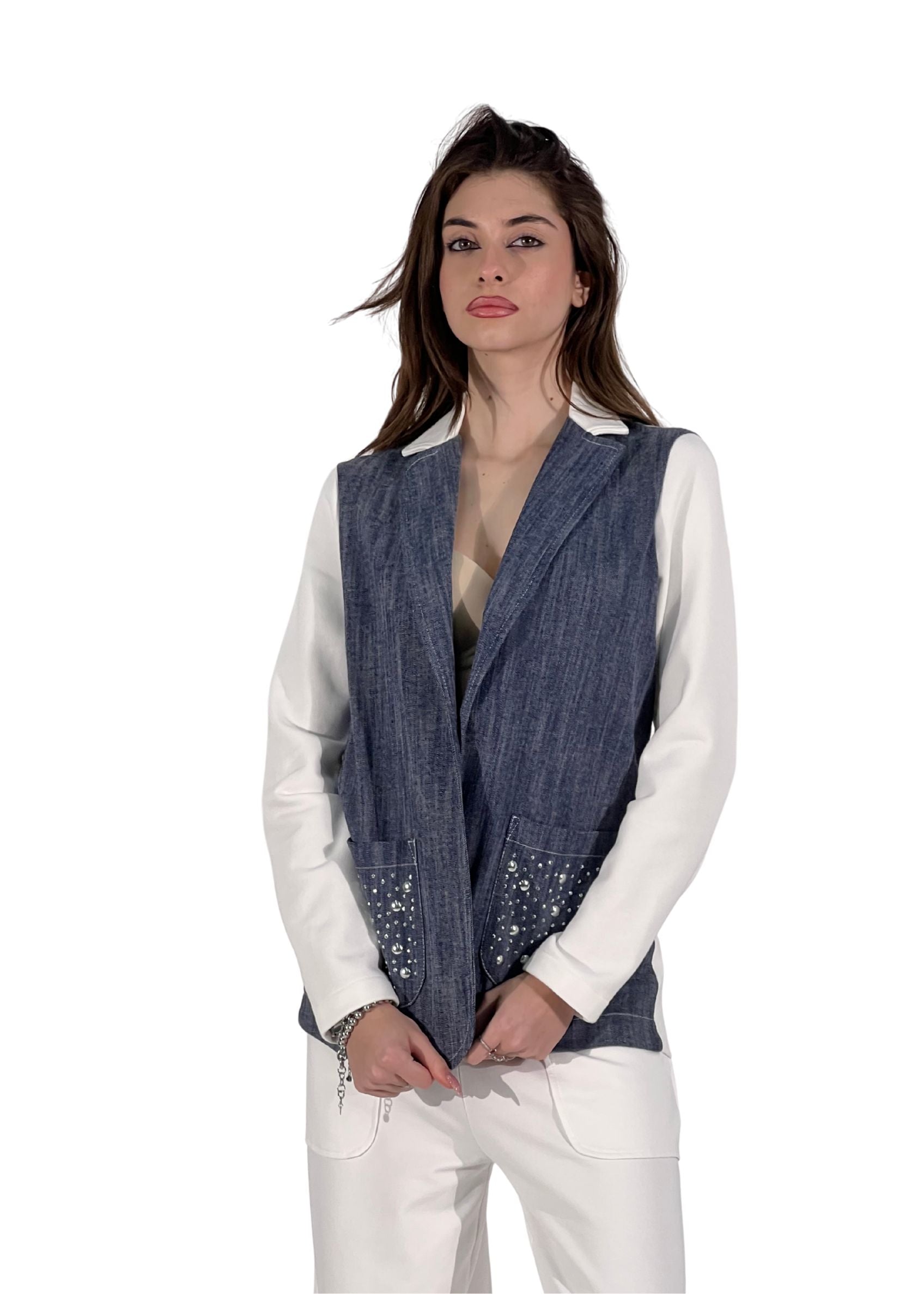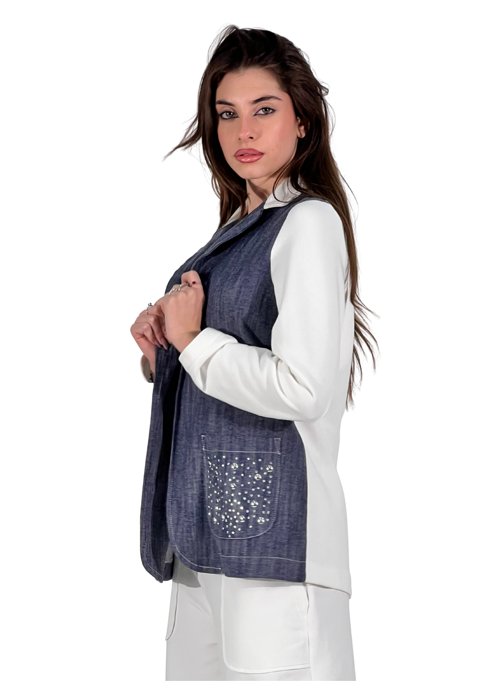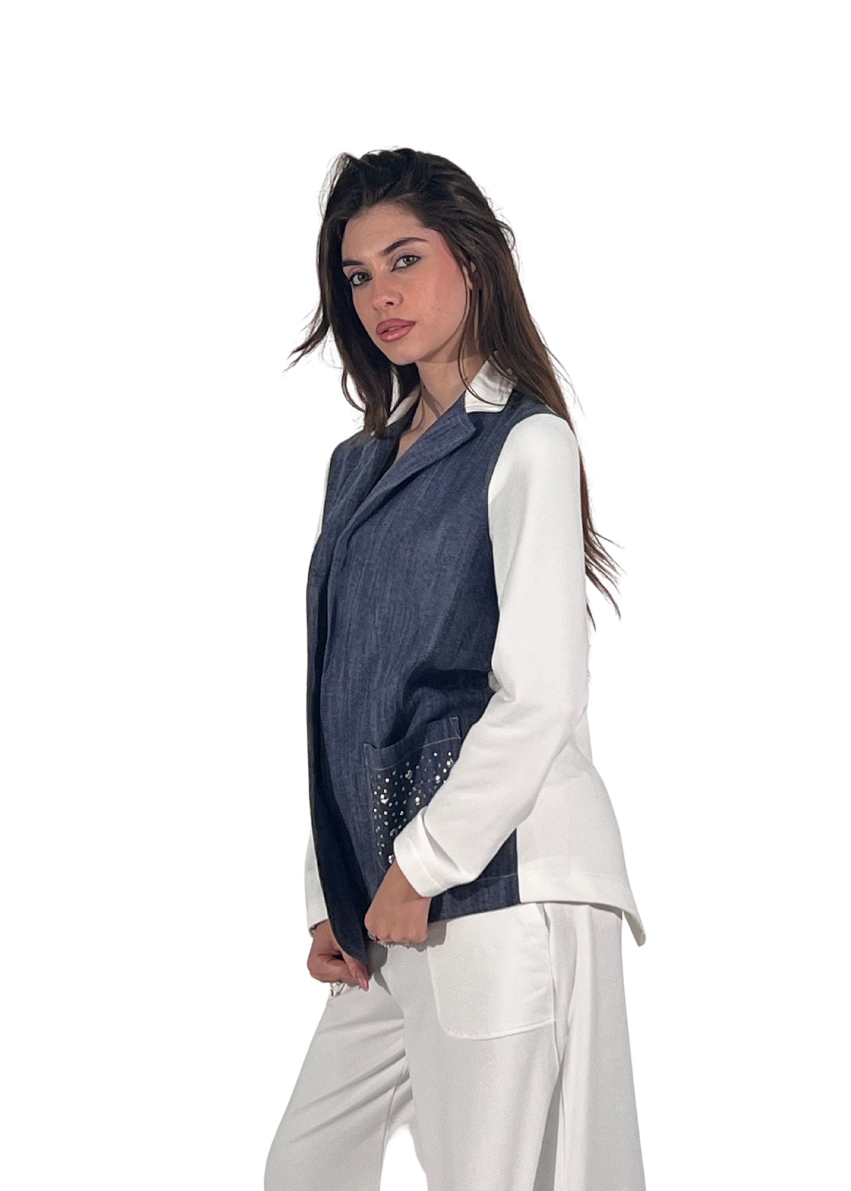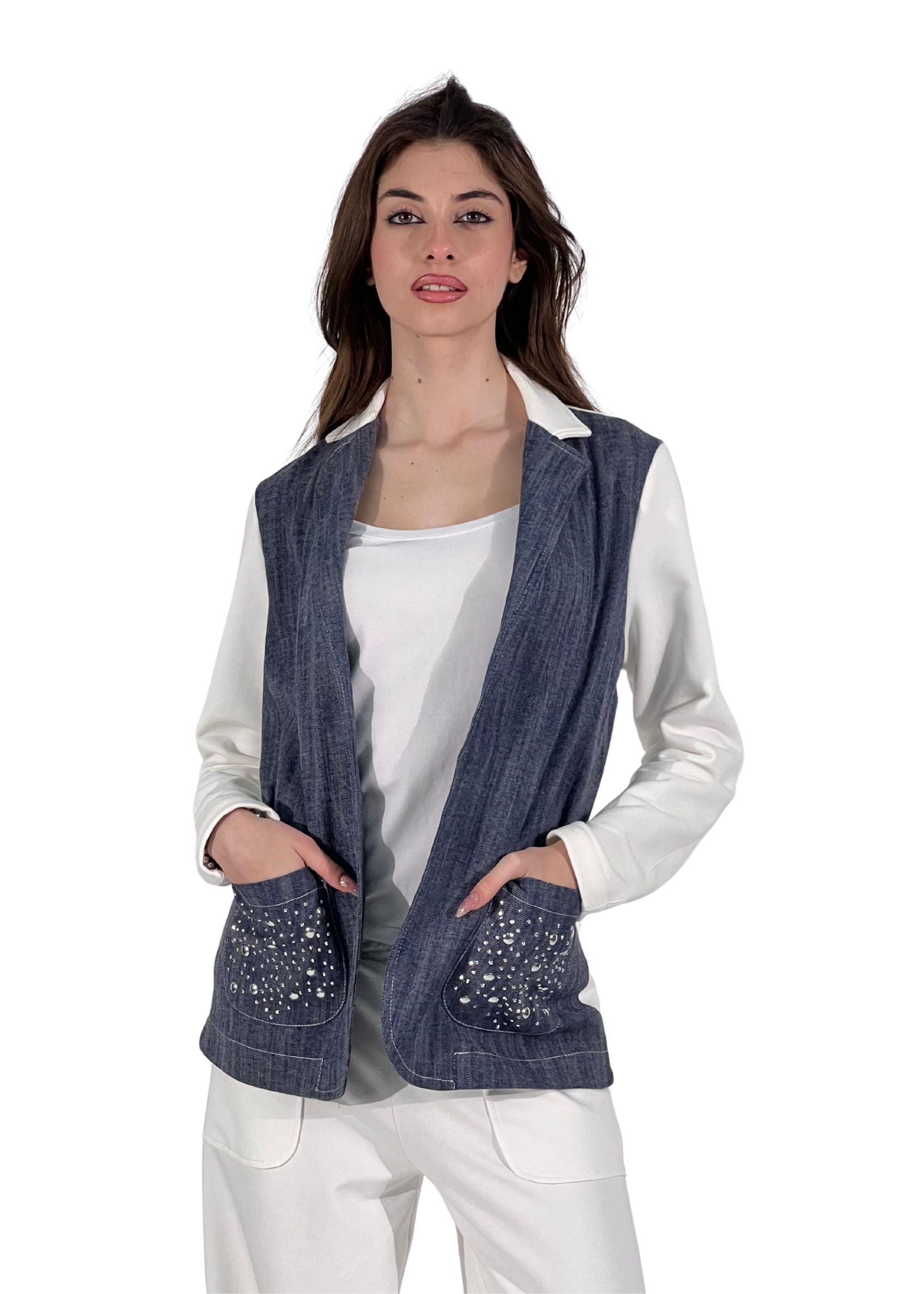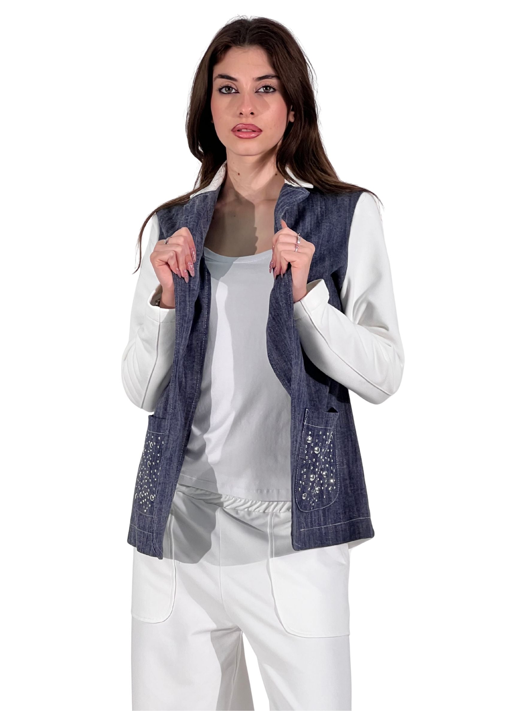 - Materiale : Parte frontale e posteriore in jeans, maniche e dettagli in felpa