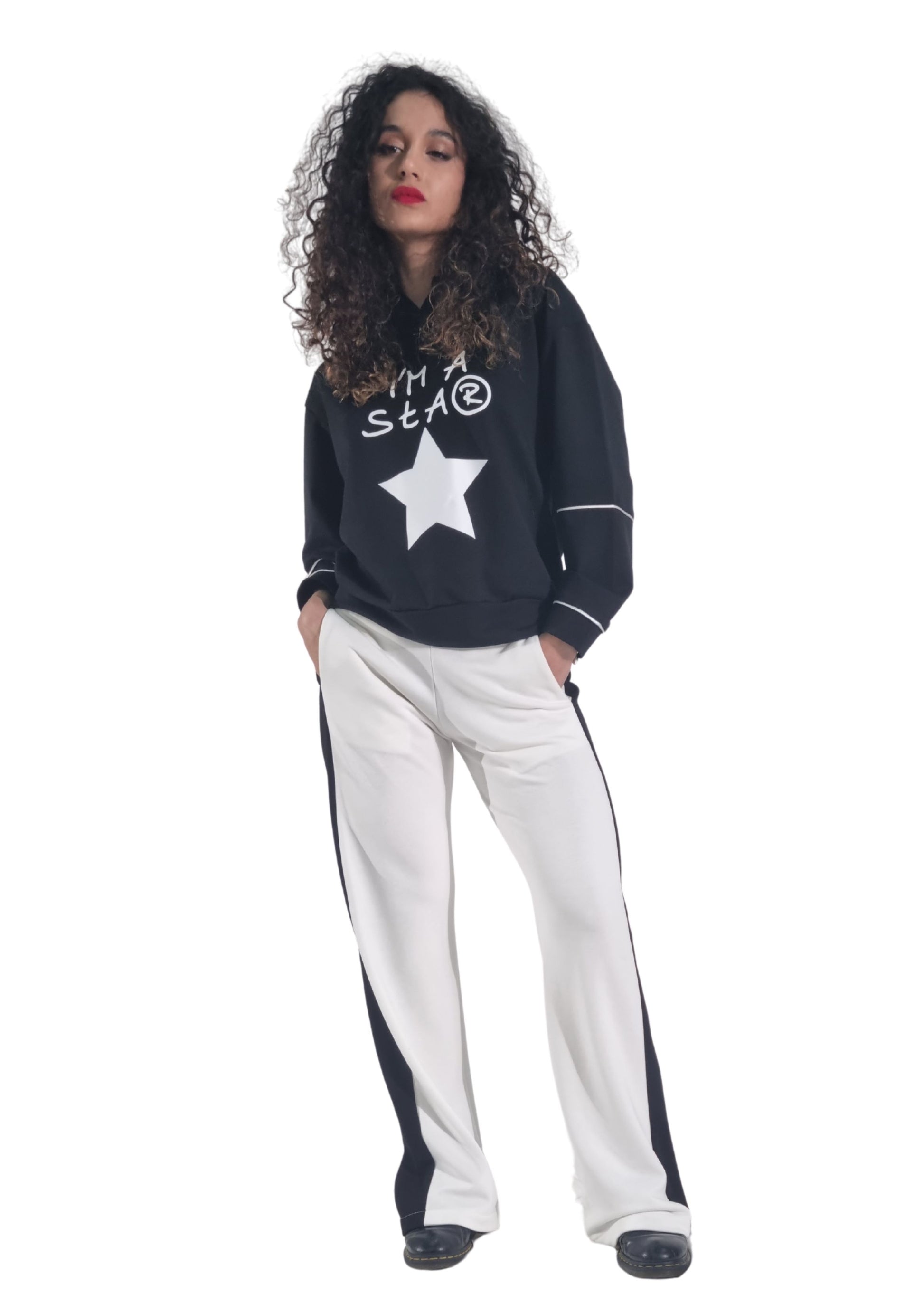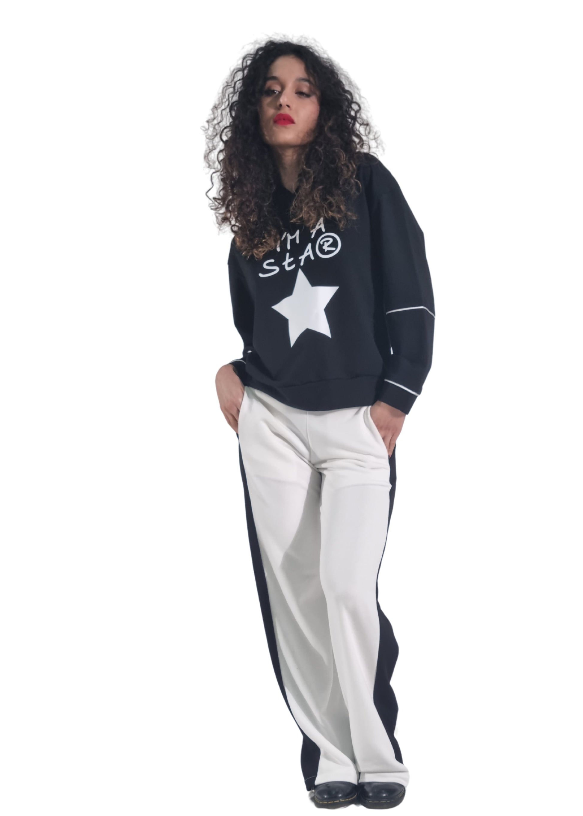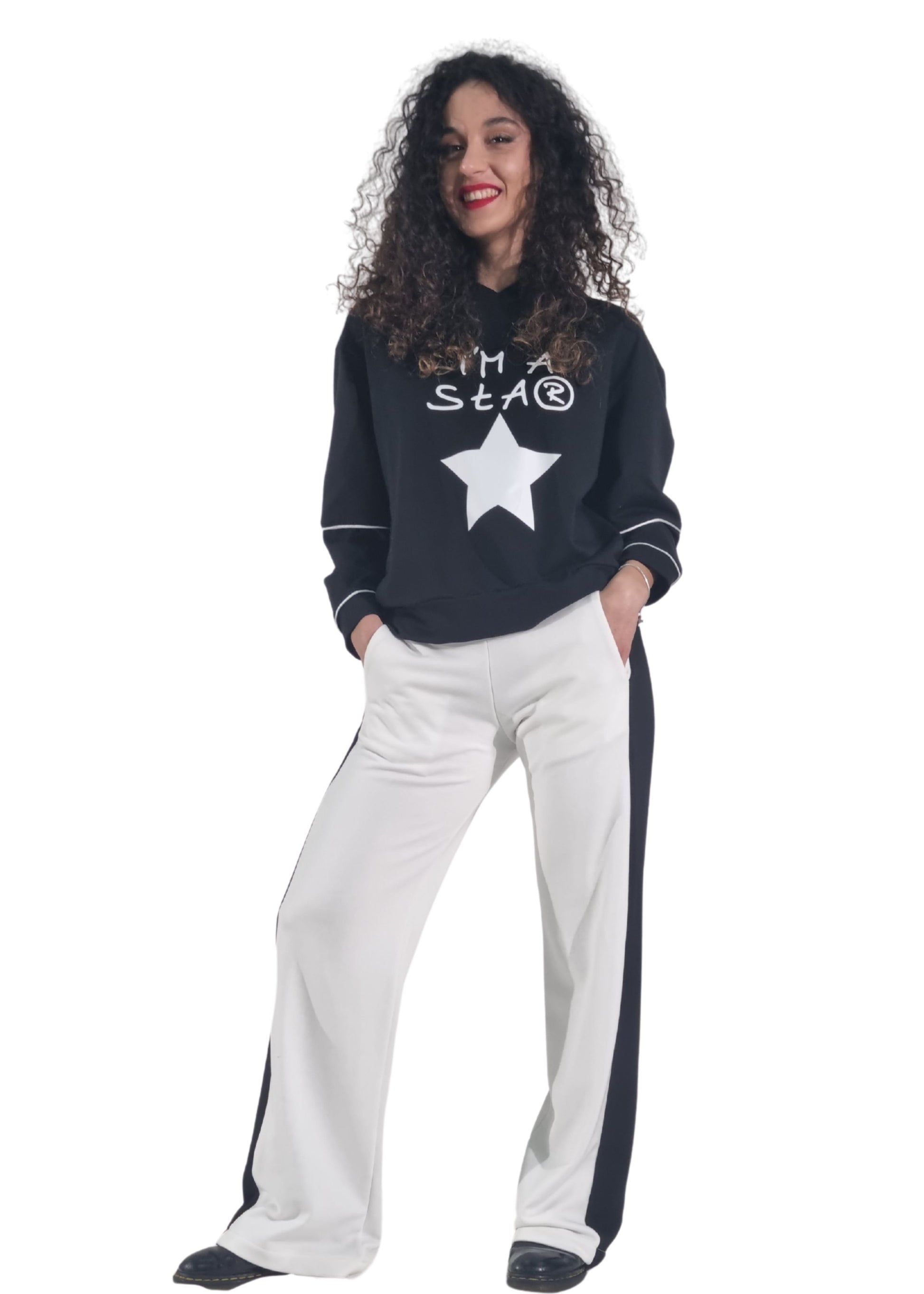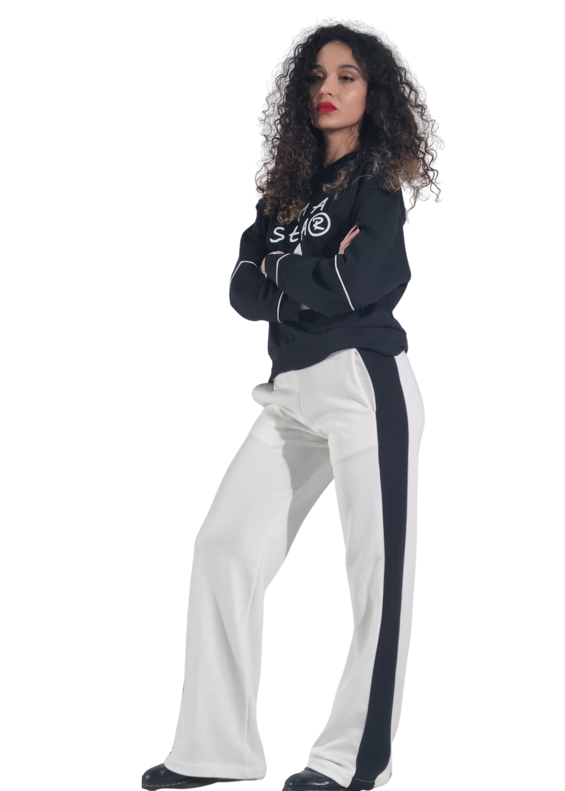 - 👖 Pantaloni ampi con banda laterale nera, effetto slanciante.