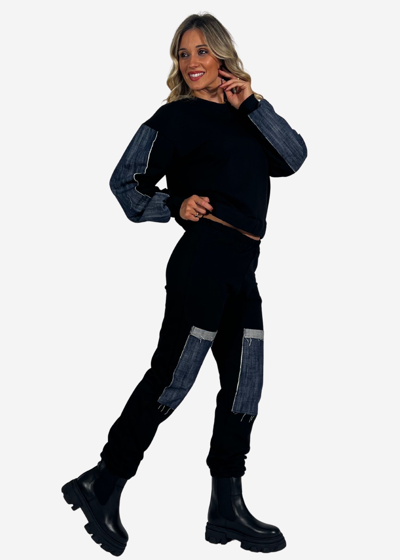 - Pantalone coordinato con patch in denim applicati sul davanti