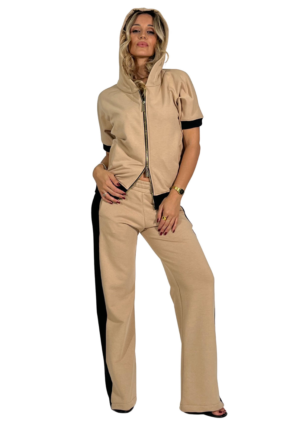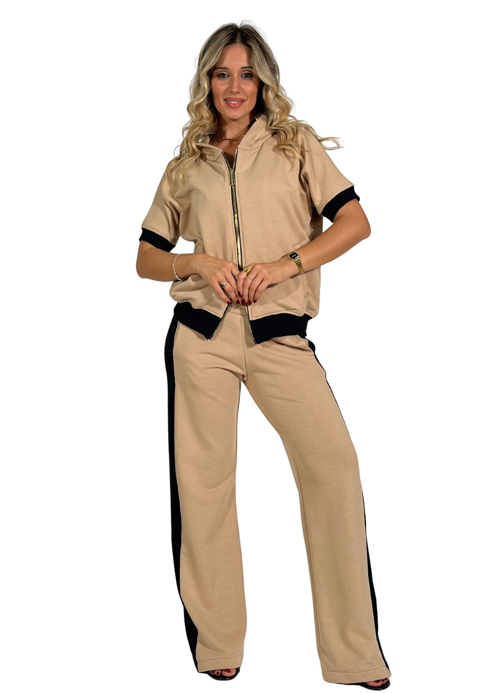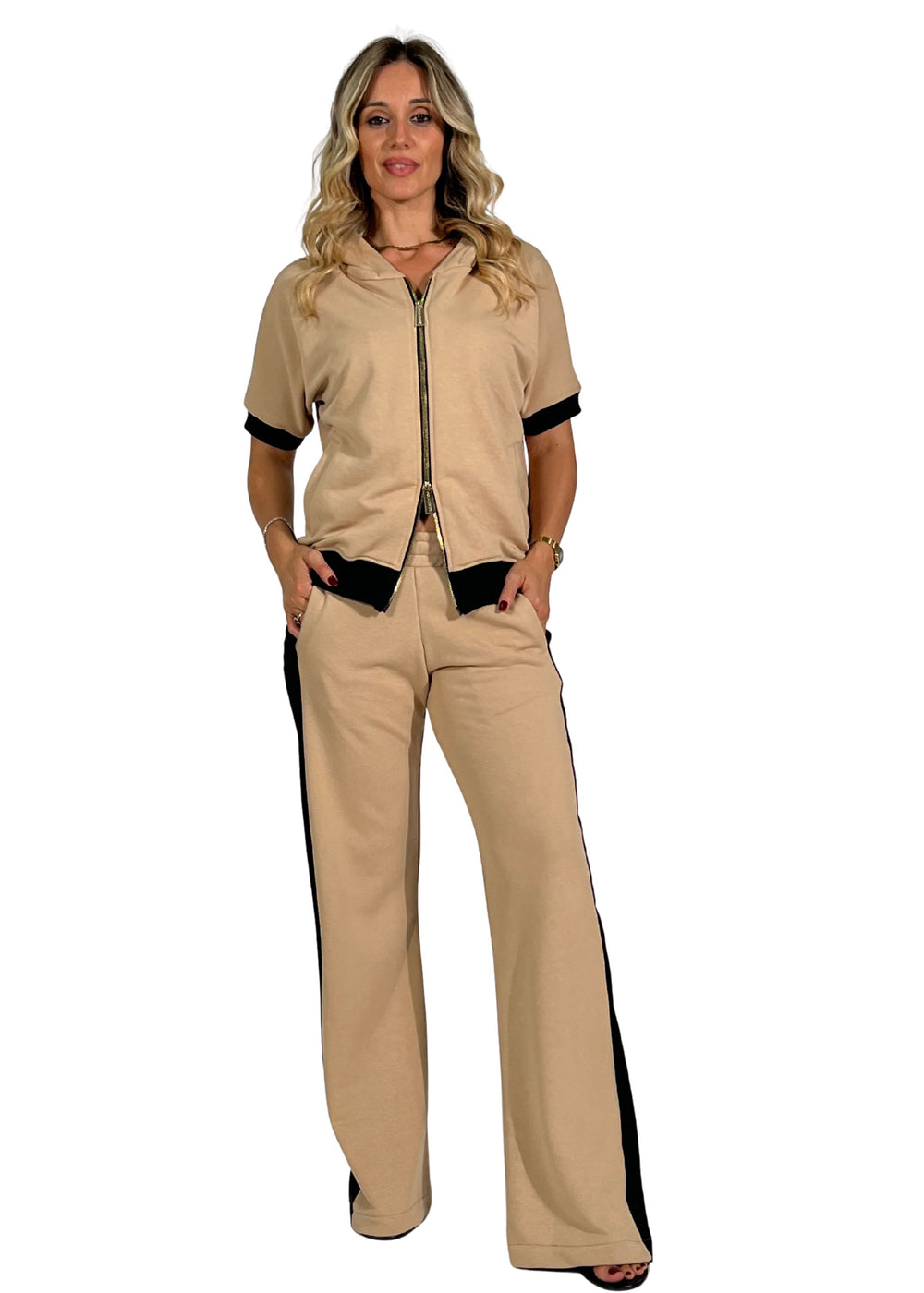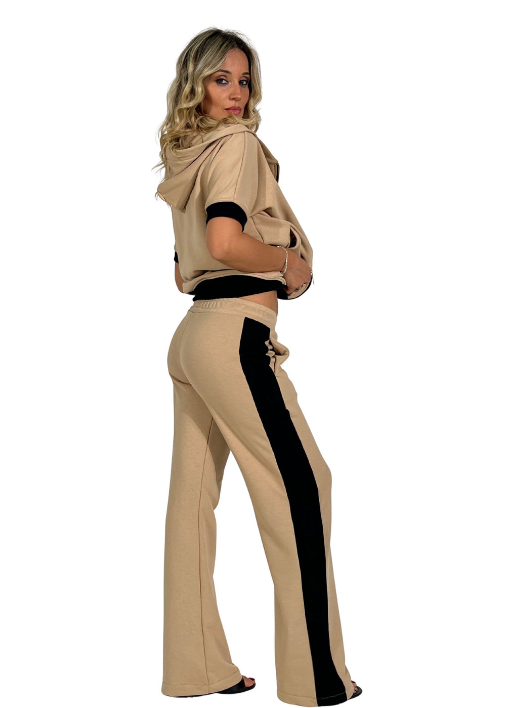 La tuta donna in felpa Viavia è il capo perfetto per chi cerca un look casual-chic e contemporaneo, capace di unire comfort e stile con un tocco raffinato. Realizzata in morbido tessuto beige con bande laterali nere, si distingue per la sua linea essenziale ma d’impatto, ideale per outfit pratici e curati.