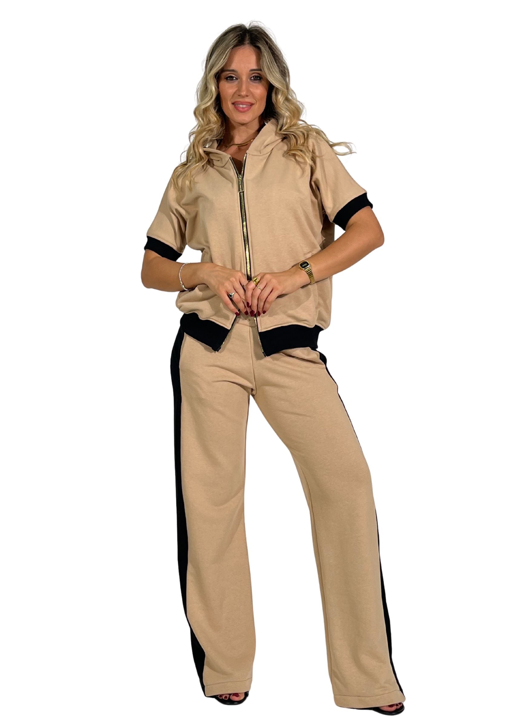 - Pantalone coordinato beige con bande laterali nere
