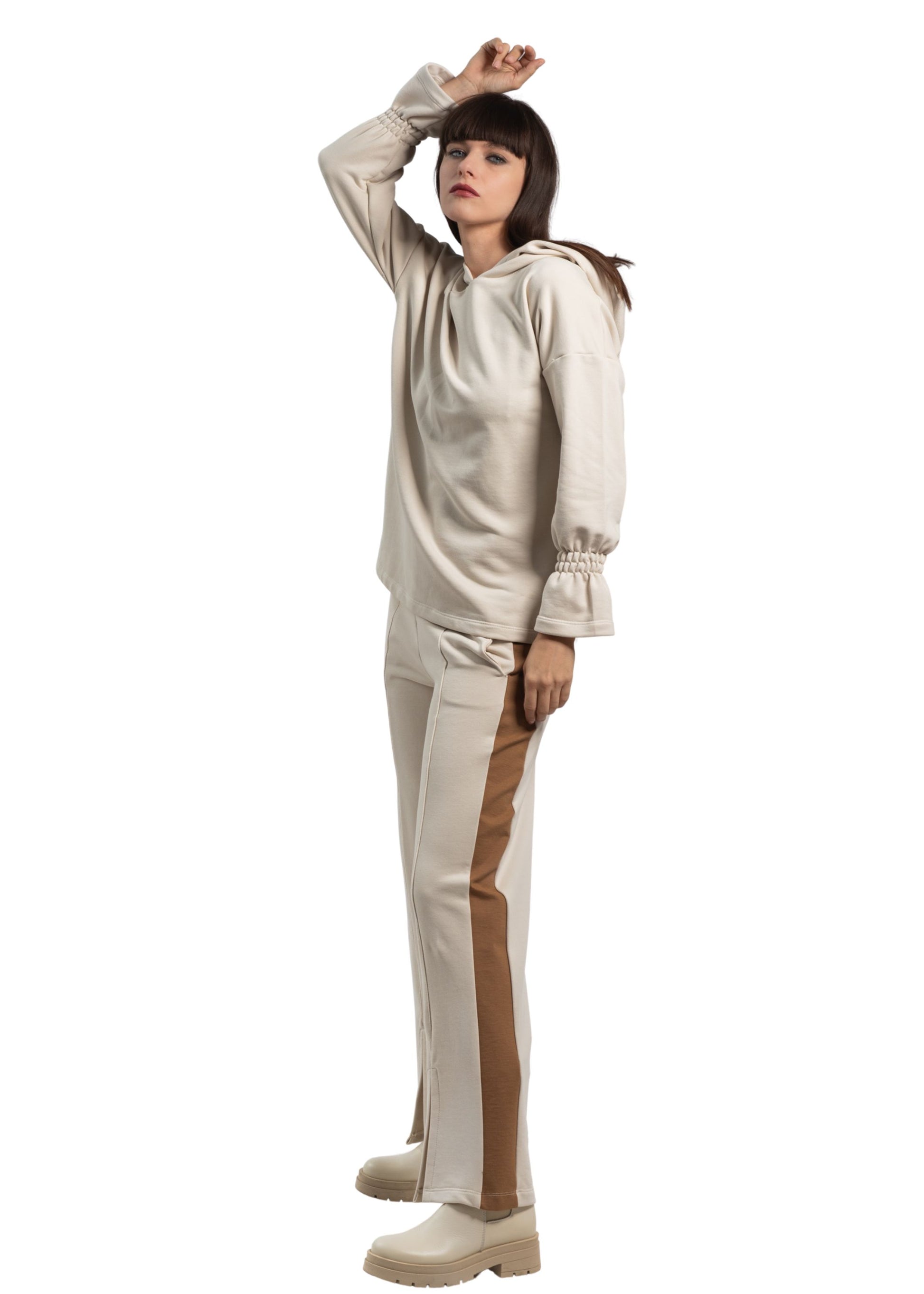 - 👖 Pantaloni ampi con bande laterali a contrasto in tonalità calde.