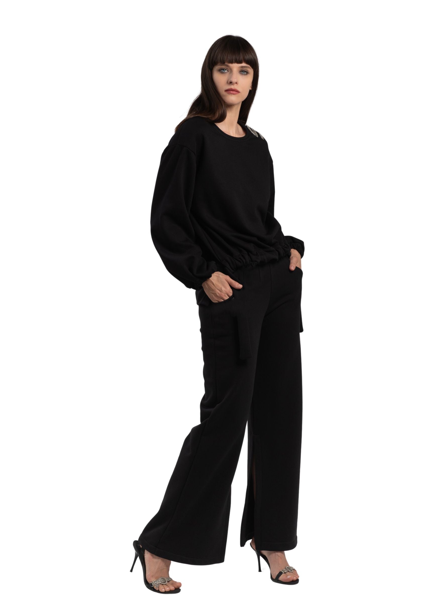 - Pantalone a gamba larga con spacco frontale e dettagli a linguetta