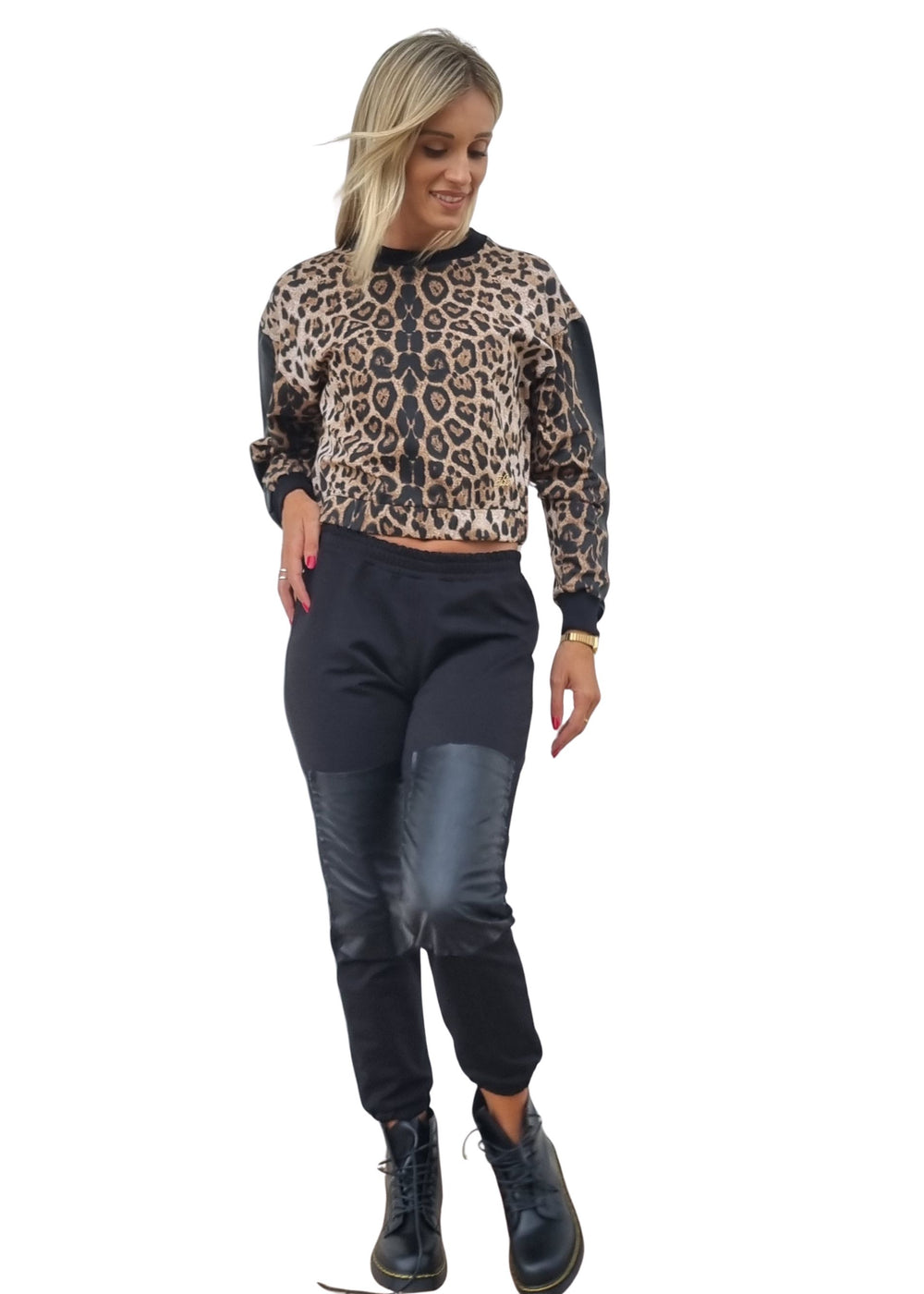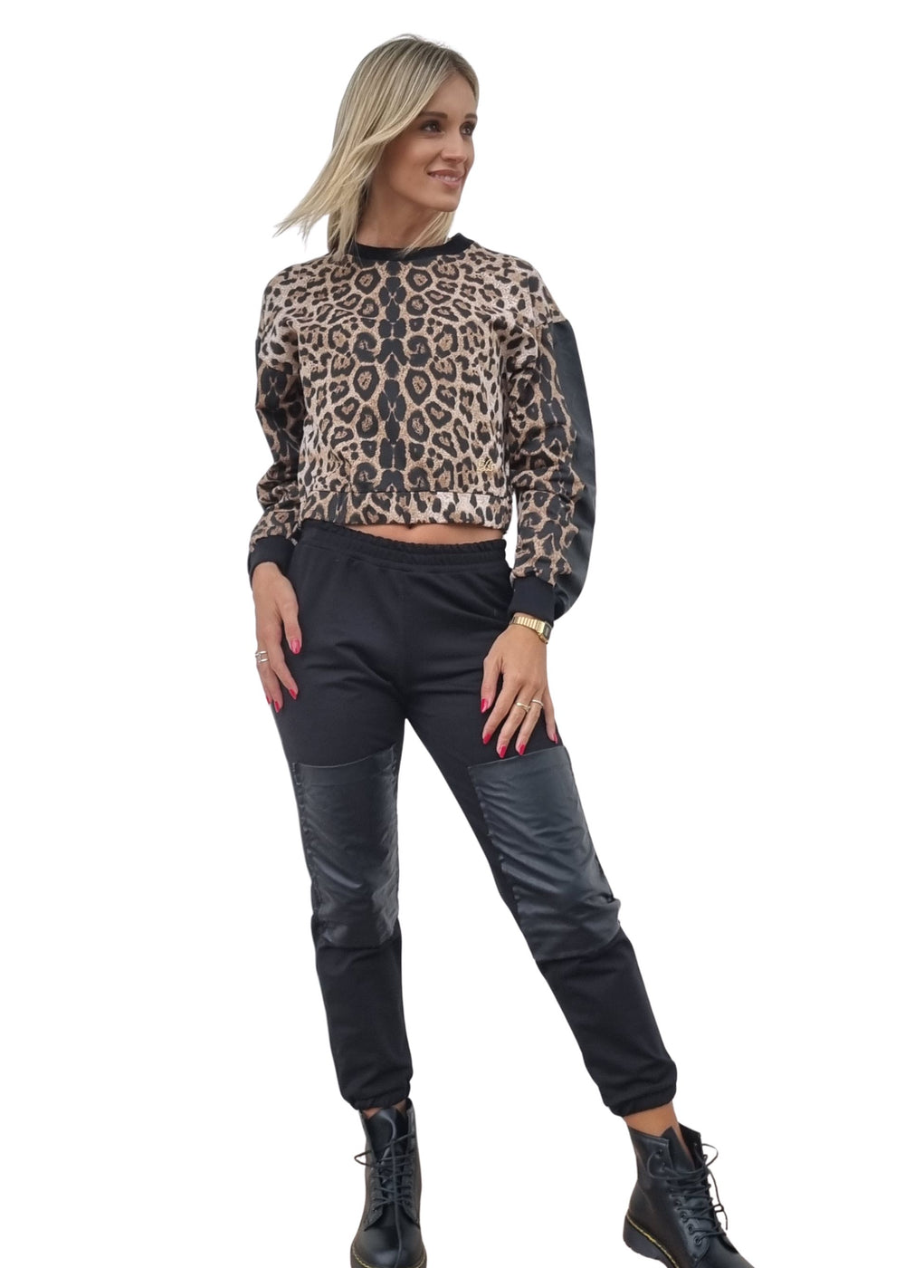 • 👖 Pantaloni neri con inserti effetto pelle sulle ginocchia.