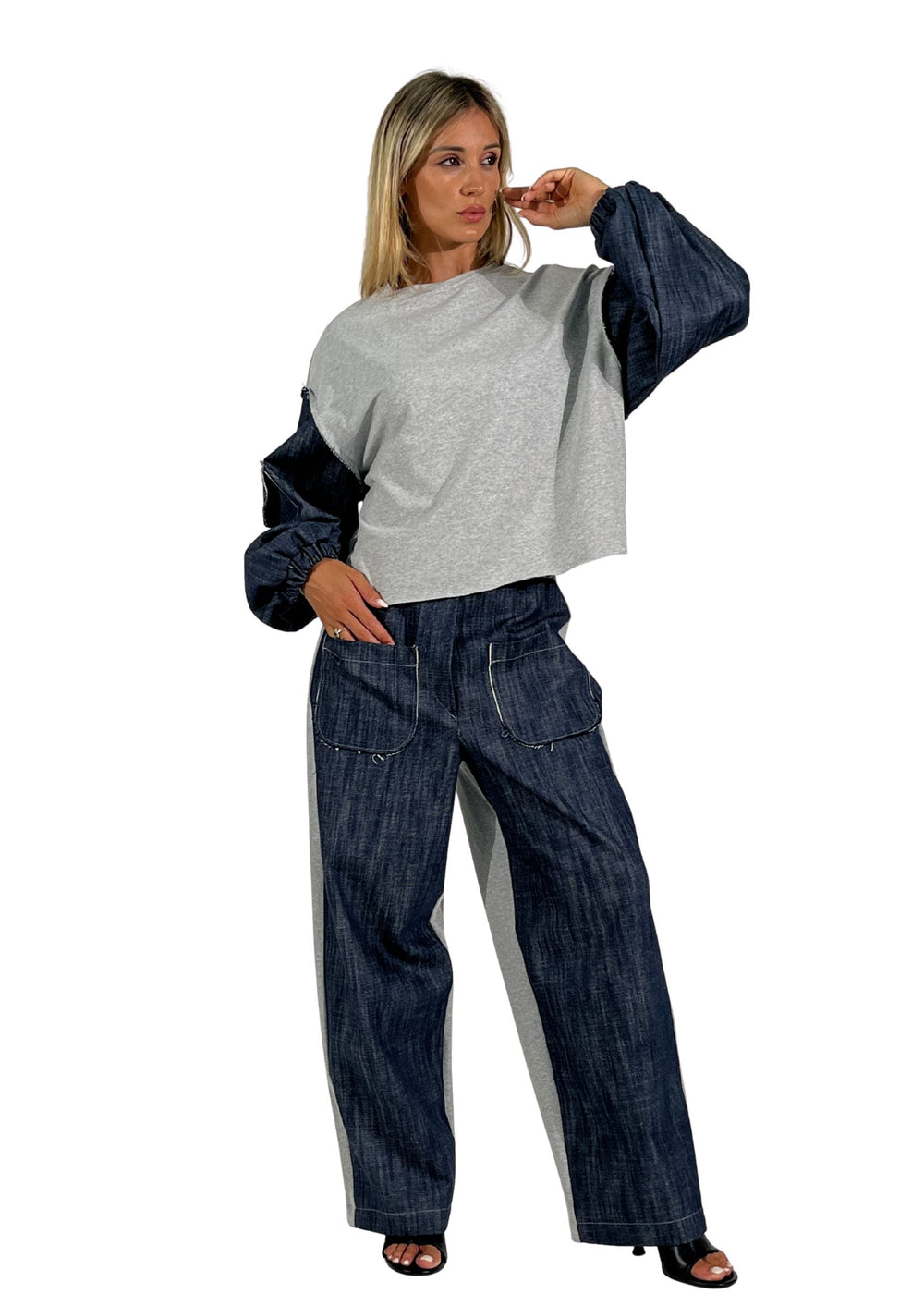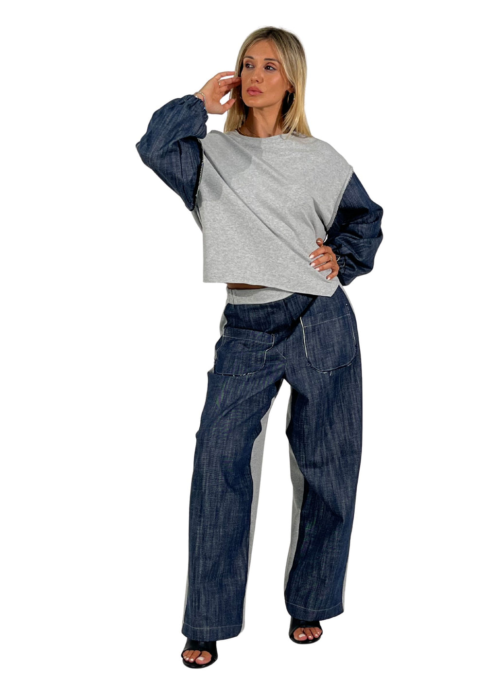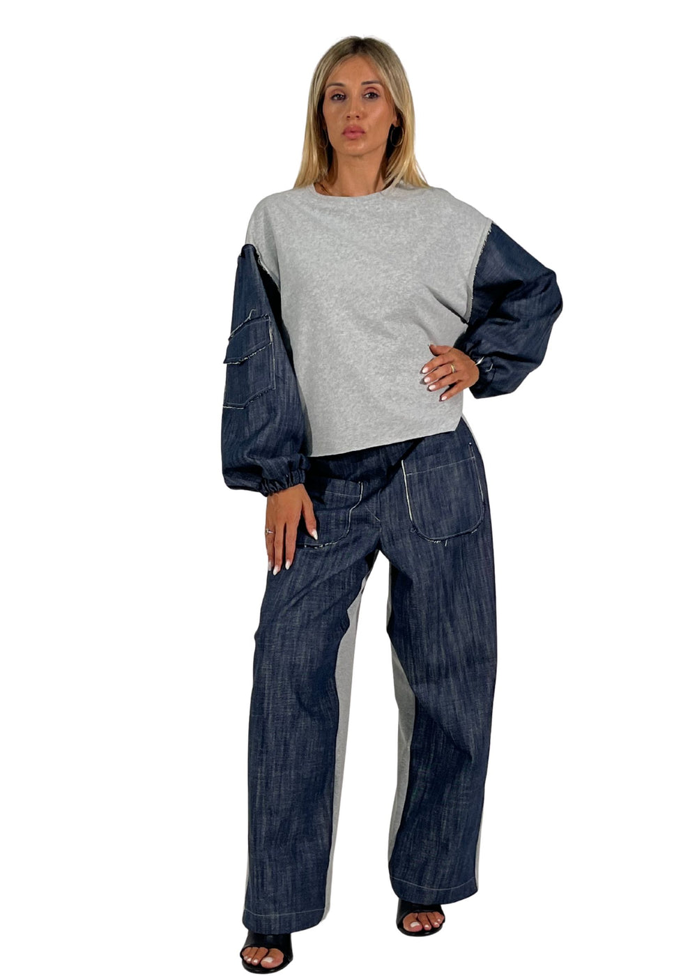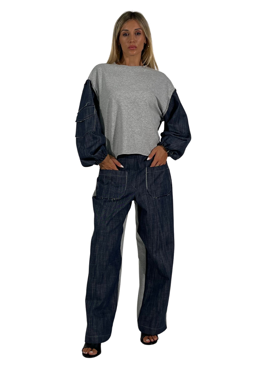 La tuta Jil è un completo dal carattere unico che unisce morbida felpa e inserti in denim blu , pensato per look versatili e contemporanei.