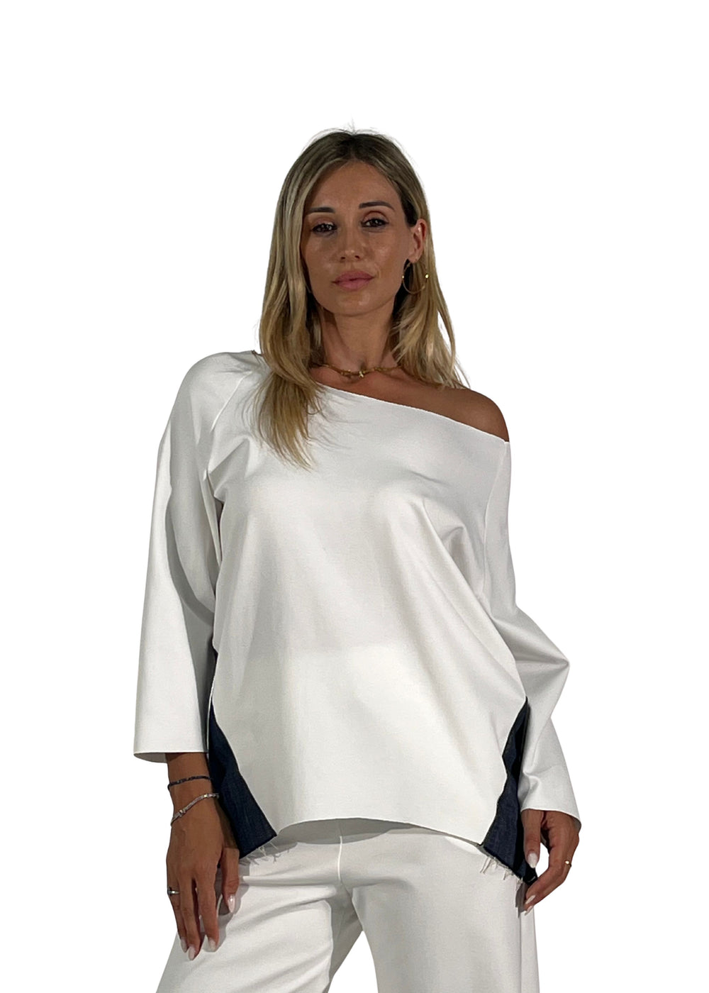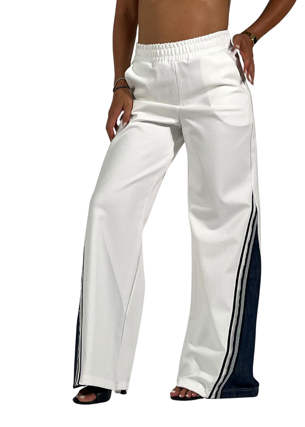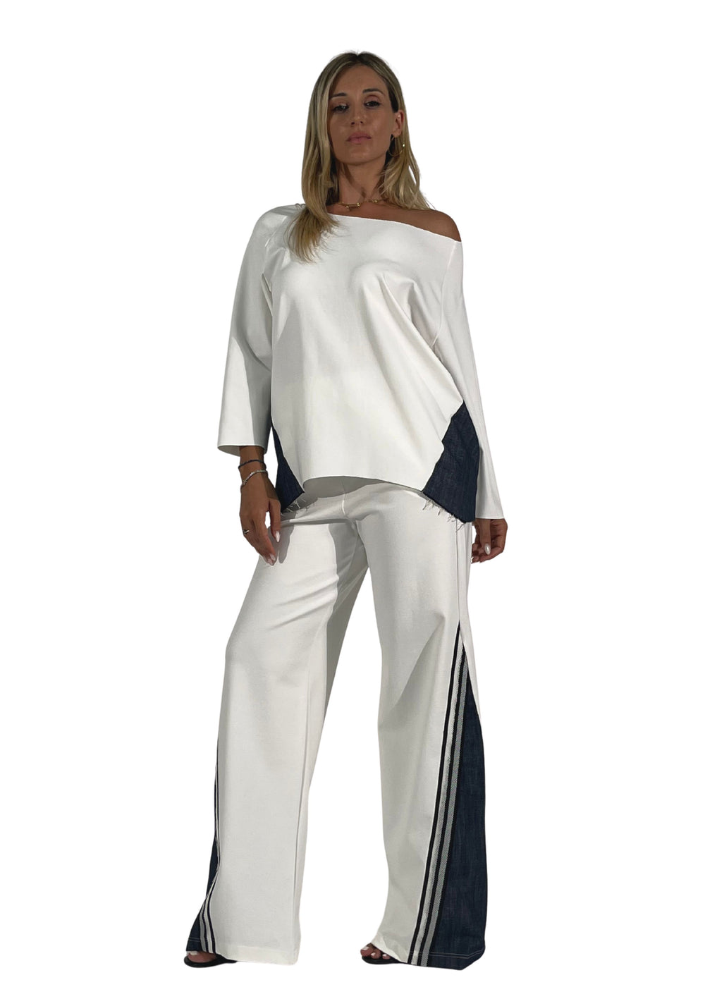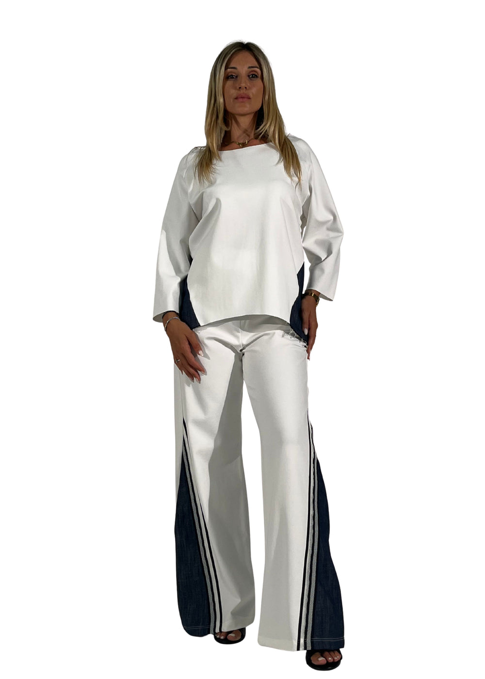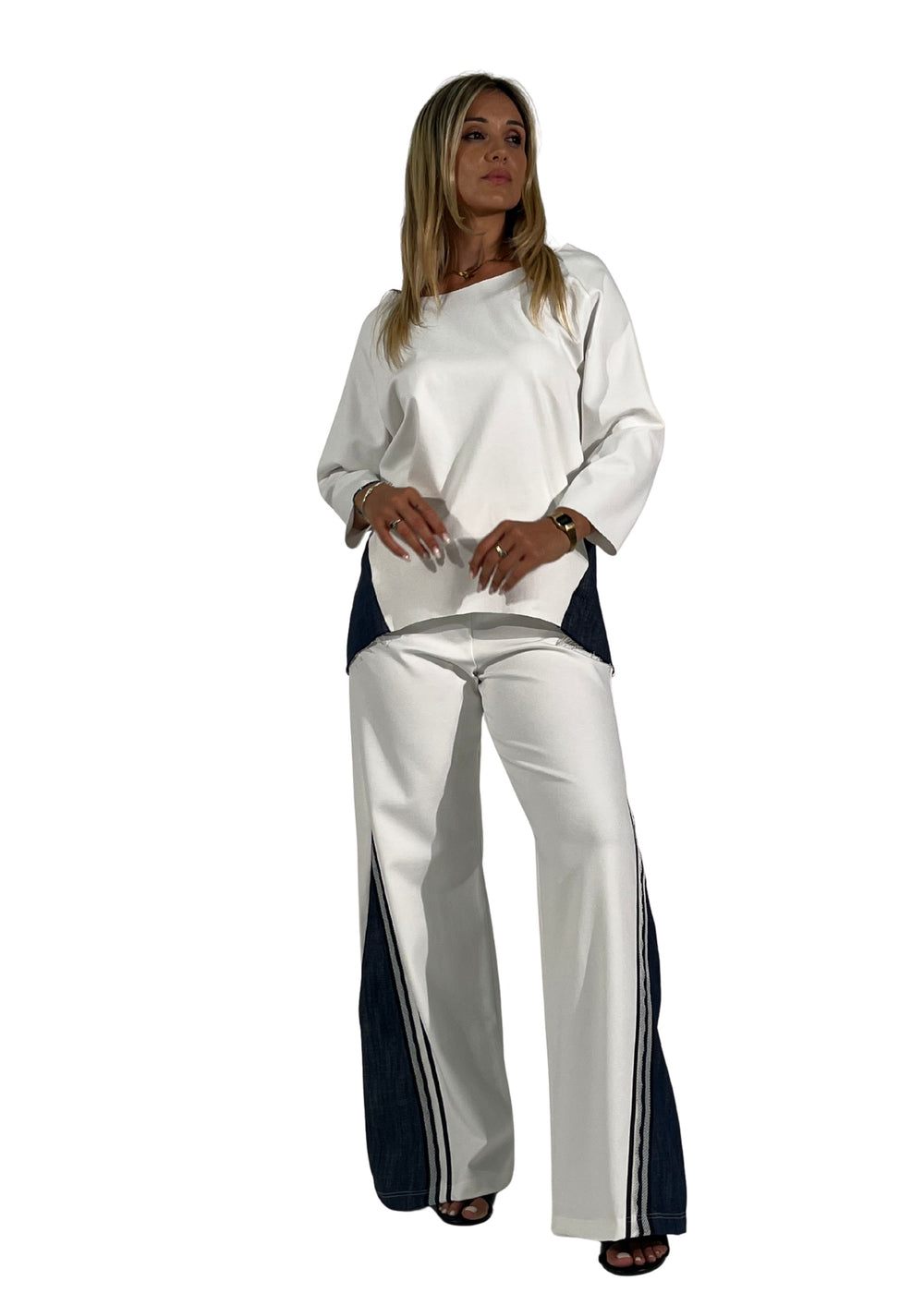 • Dettagli in denim : inserti laterali in jeans scuro su top e pantaloni per un contrasto moderno.