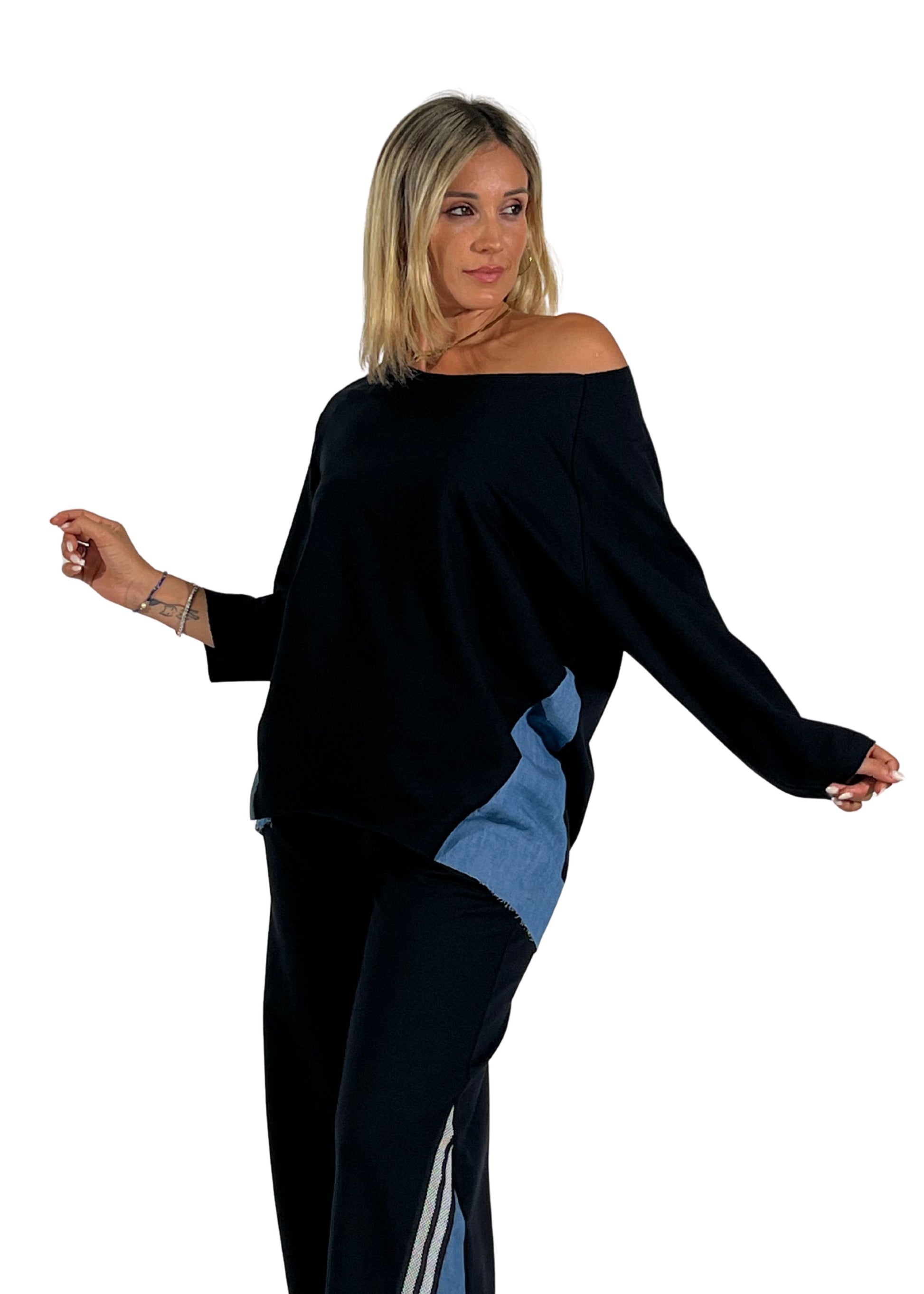 - Dettagli in denim : inserti laterali in jeans scuro su top e pantaloni per un contrasto moderno.