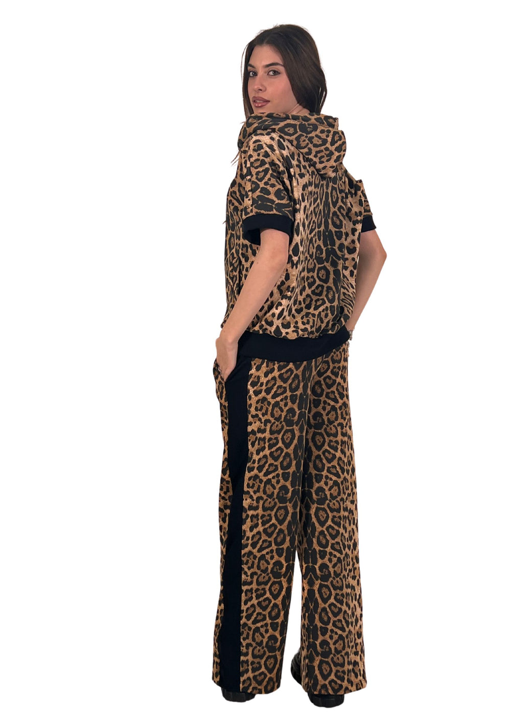 ✔ Design esclusivo: Tuta completa in felpa con stampa leopardata e dettagli neri a contrasto.