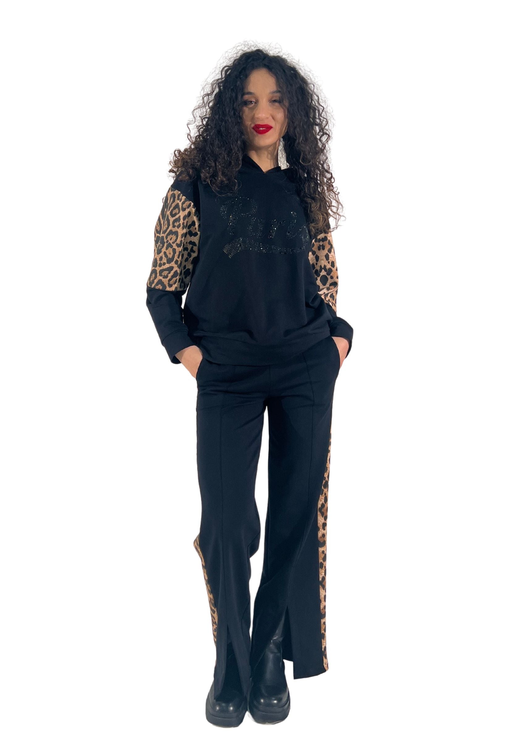 - Dettagli animalier: Maniche della felpa in stampa leopardata per un effetto audace, Bande laterali dei pantaloni coordinate in fantasia animalier.