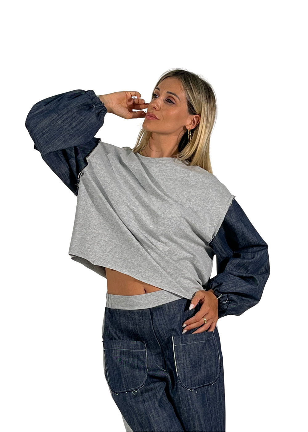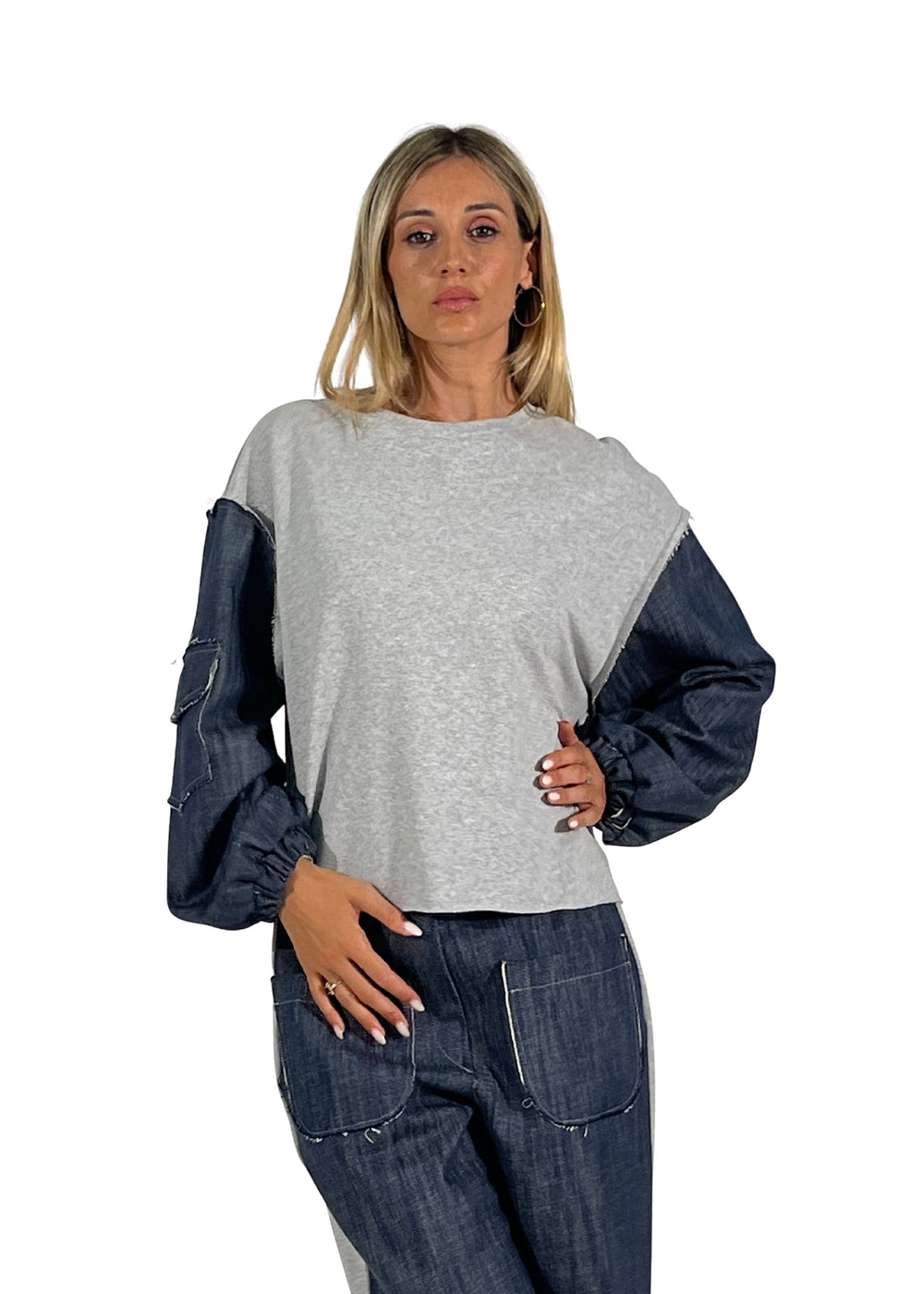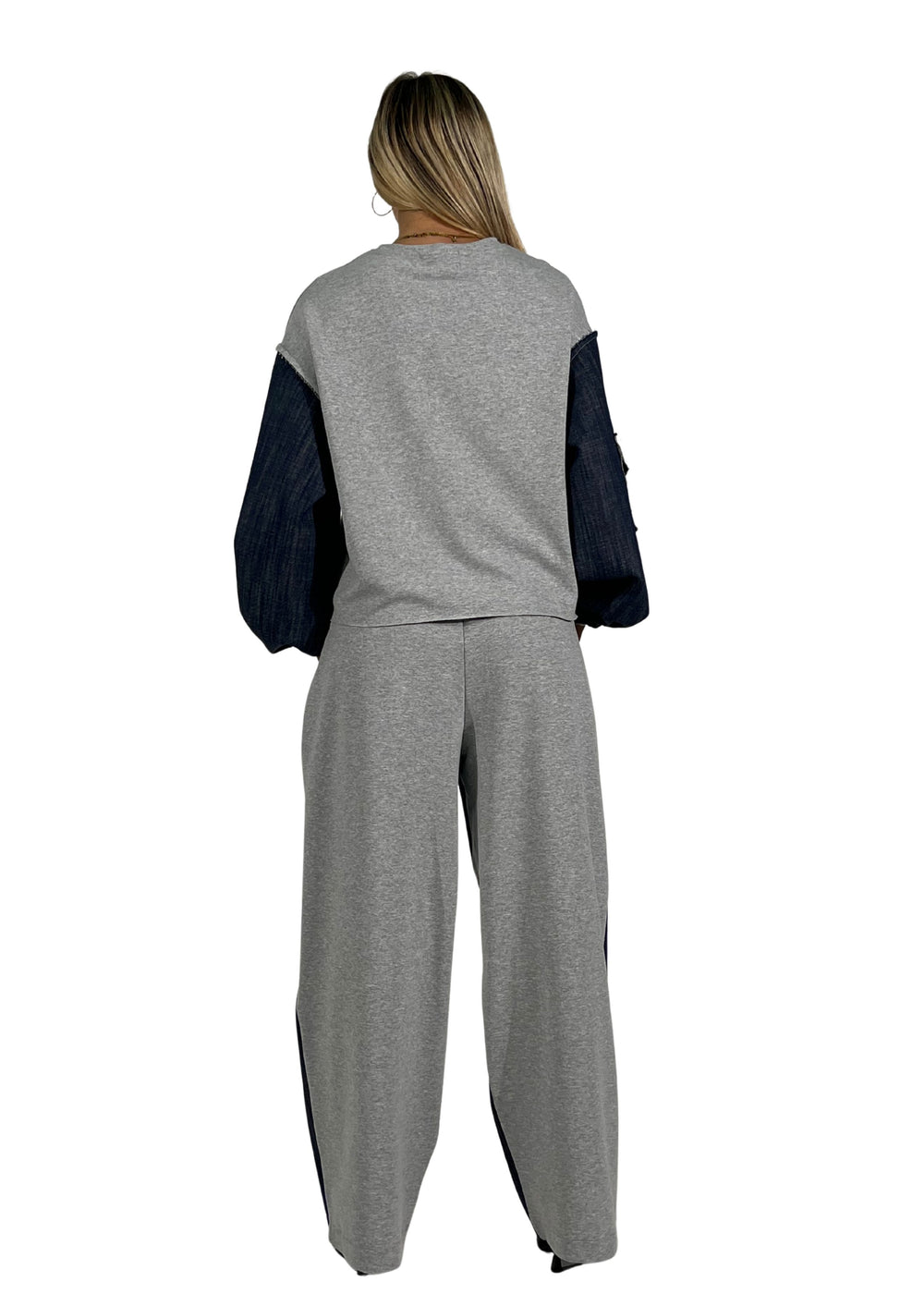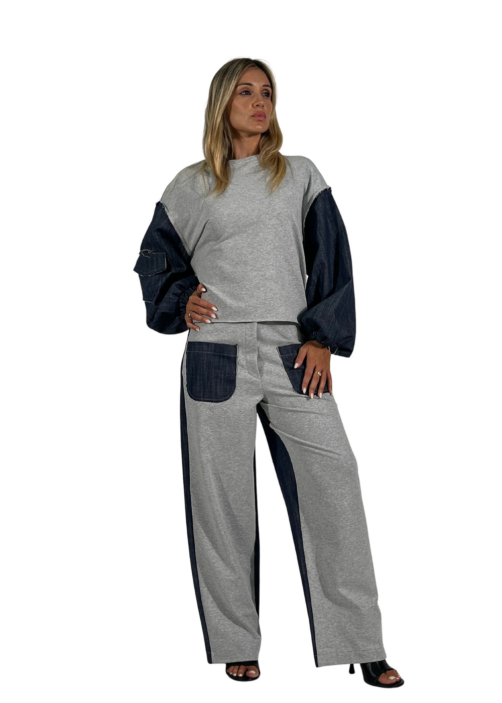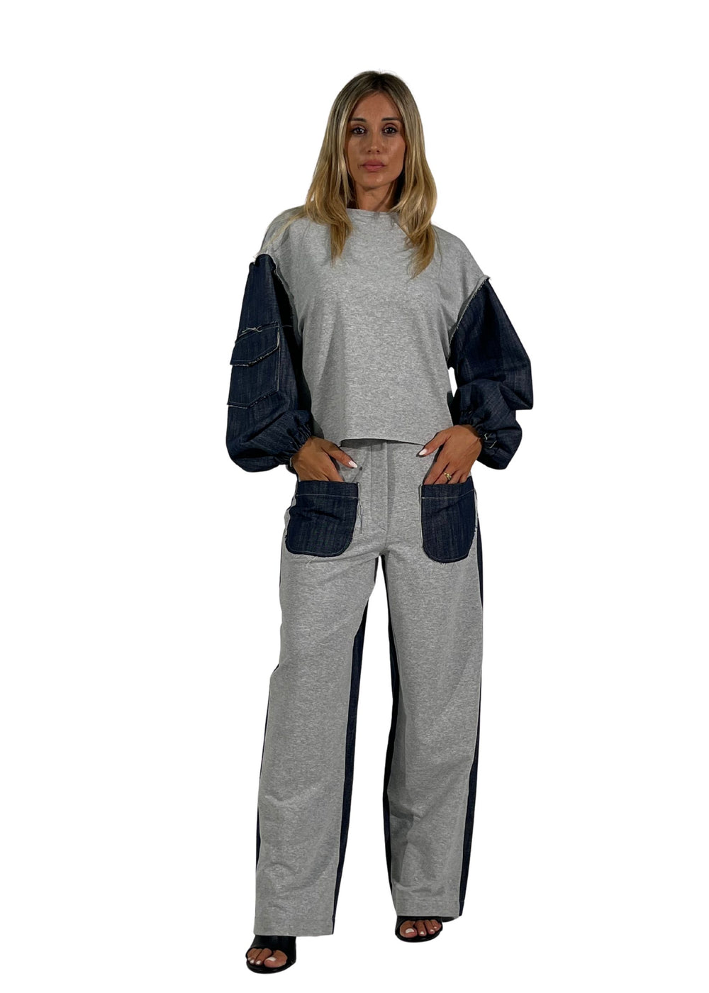La tuta Violet è un completo dal carattere unico che unisce morbida felpa e inserti in denim blu, pensato per look versatili e contemporanei.