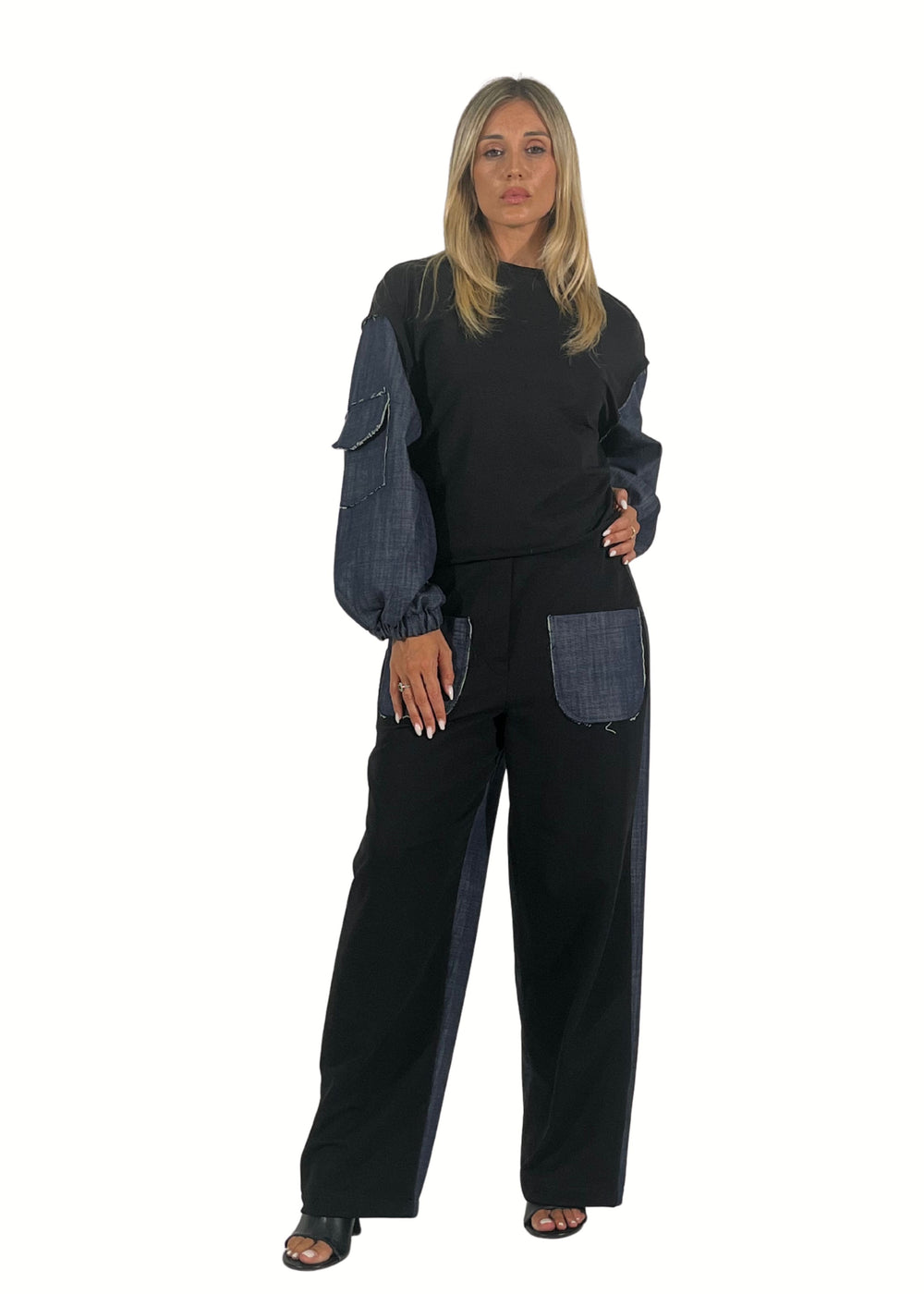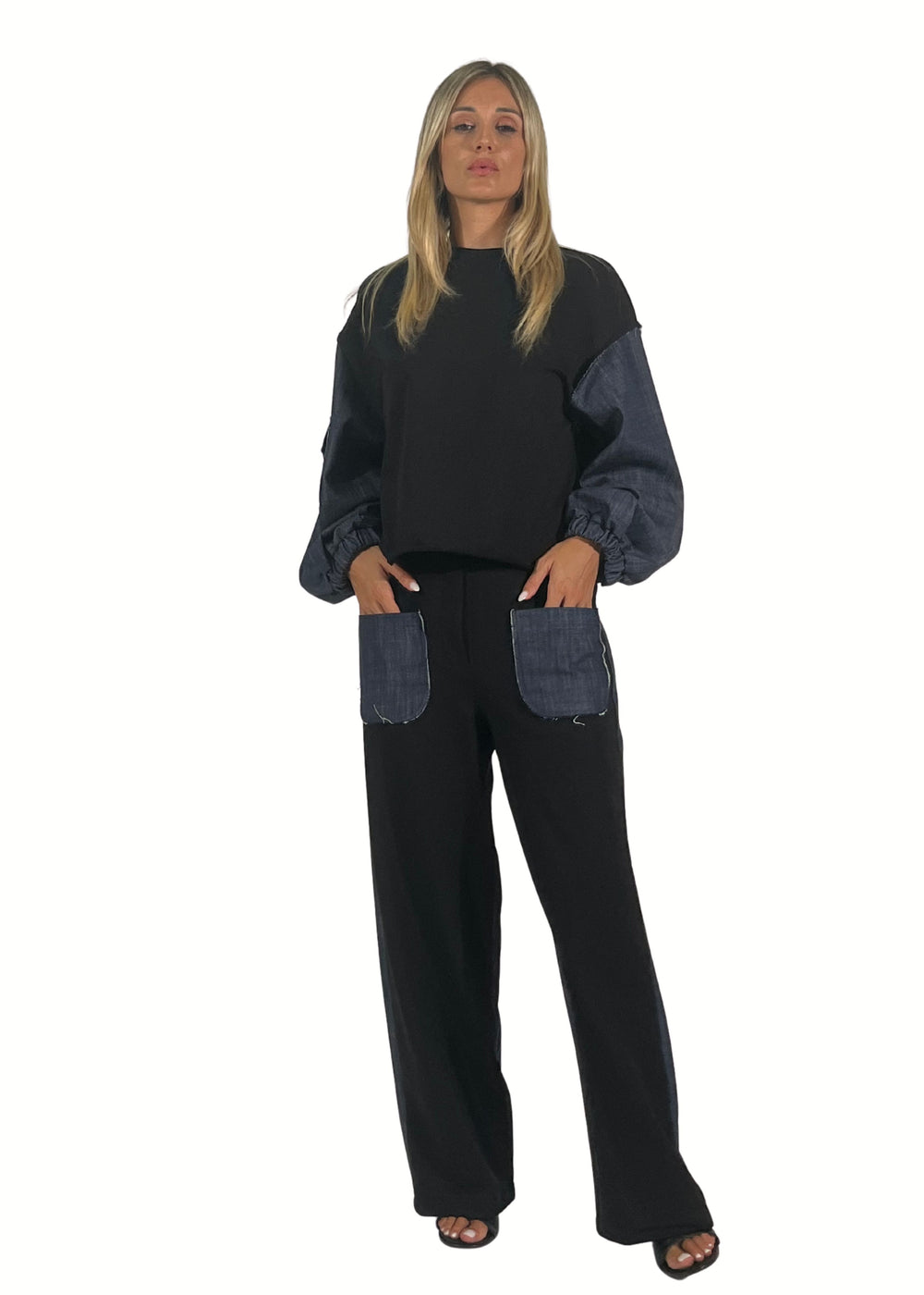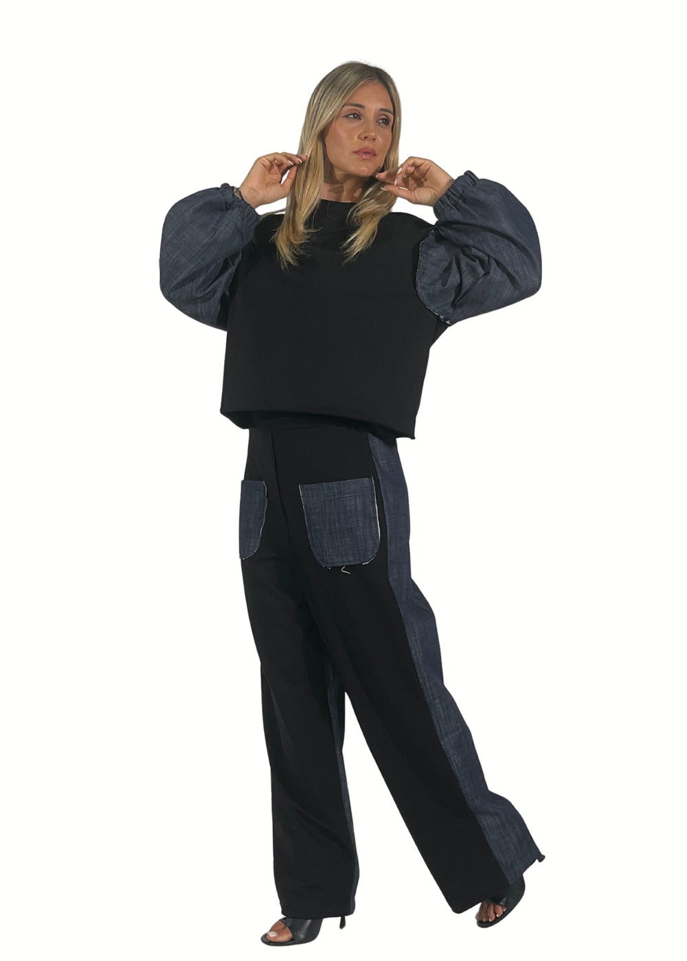 La tuta Violet è un completo dal carattere unico che unisce morbida felpa e inserti in denim blu, pensato per look versatili e contemporanei.