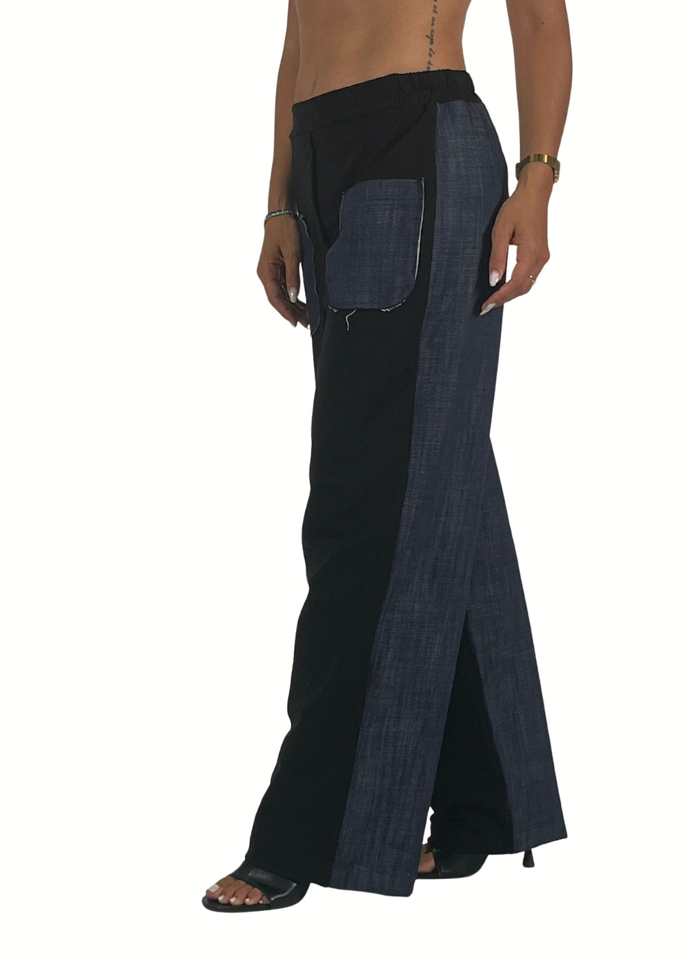L’elemento distintivo è il pantalone con fronte e retro diversi, che crea un contrasto originale e dona un tocco urban chic.